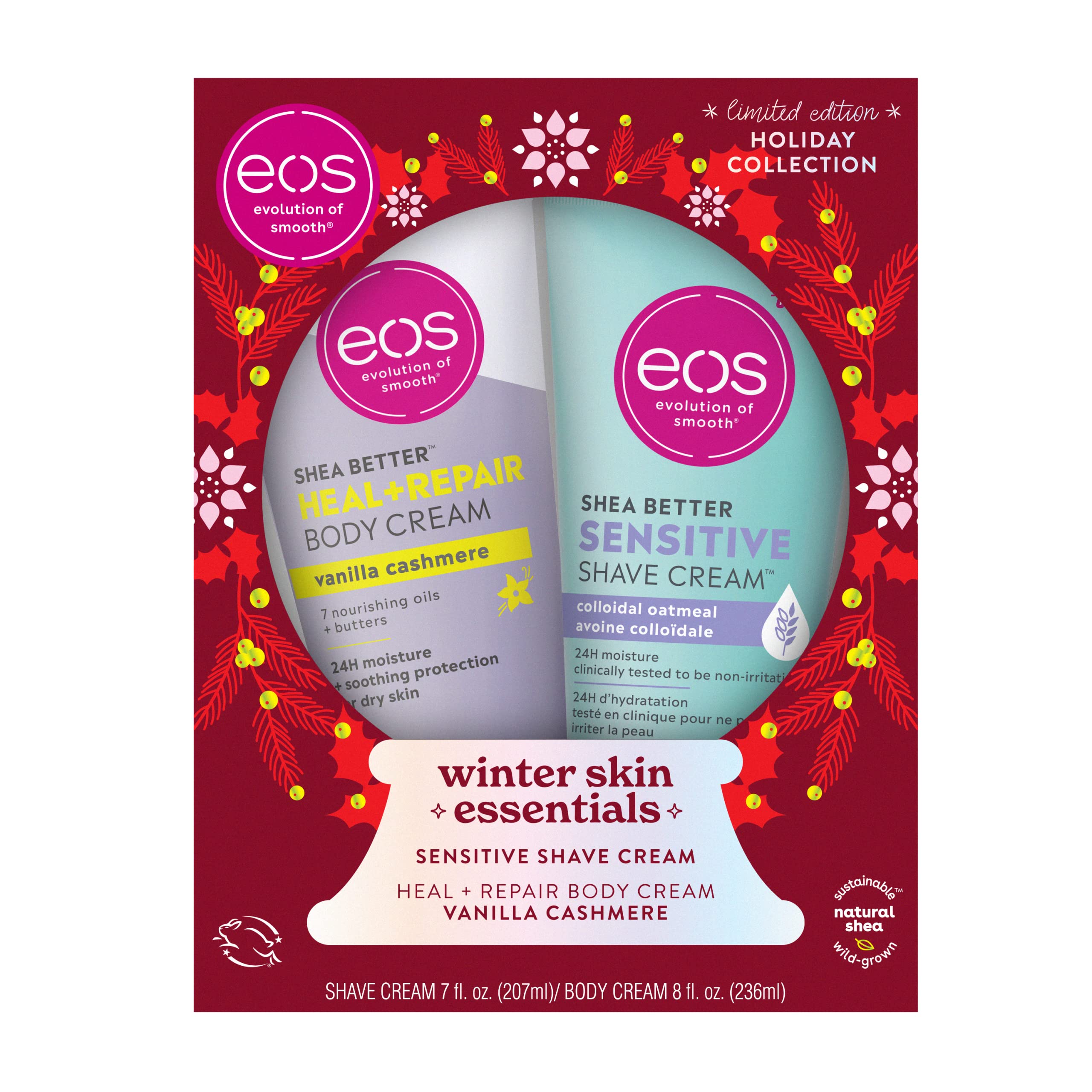 PERFECT HOLIDAY GIFT: Our Holiday skin care and lip care products are the most perfect Christmas gifts, stocking stuffers, and our packaging is a festive touch to add as a Christmas tree decoration!. ALL-NATURAL SHEA BUTTER: eos products have wild grown, sustainably-sourced 100 natural shea butter to make skin feel moisturized, protected and soft. We are paraben, phthalate and gluten free. Dermatologist tested. Hypoallergenic. PETA certified. No products tested on animals. SHEA BETTER HEAL REPAIR BODY CREAM: Our ultra-rich body cream gives 24H hydration with Shea Oil Shea Butter, and smells like cozy Vanilla Cashmere. SHEA BETTER SENSITIVE SHAVE CREAM: Shave all your hair, any type, anywhere with colloidal oatmeal to soothe and protect sensitive skin. 24-HOUR HYDRATION: Soothe and protect your skin with our 24-hour hydration skin care products!. WINTER SKIN ESSENTIALS: This Limited Edition Holiday Body Collection contains our Shea Better Sensitive Shave Cream and Shea Better Heal Repair Vanilla Cashmere Body Cream, perfect for gift giving or keeping for yourself!.