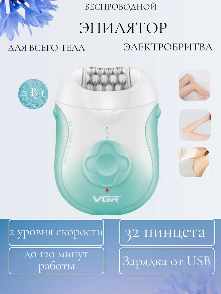 Депилятор оснащен насадками, которые позволяют эффективно работать с разными областями тела, включая бикини, подмышки и ноги.
