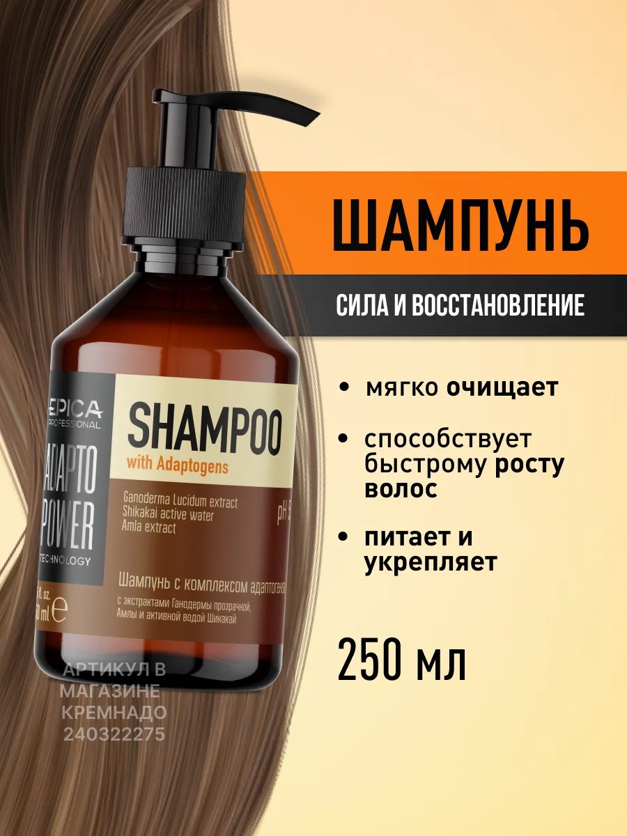 Шампунь восстанавливающий от epica professional — это специальное средство, разработанное для ухода за ослабленными, поврежденными и тусклыми волосами. Epica шампунь для волос помогает вернуть им силу, упругость и здоровый блеск, делая их более крепкими и устойчивыми к внешним воздействиям. В состав шампуня для восстановления волос входит комплекс адаптогенов, которые проникают глубоко в структуру волоса, заполняя пустоты и восстанавливая поврежденные участки. Экстракт гриба Ganoderma lucidum, обогащенный ганодериновой кислотой, повышает плотность и силу волос, а также обладает противовоспалительными свойствами. Фитокомплекс экстрактов Амлы и бобов Шикакай богат аскорбиновой кислотой, интенсивно увлажняет и упреждает появление перхоти и сухости. При регулярном использовании шампуня для восстановления волос волосы становятся более мягкими, эластичными и легко поддаются укладке. Они приобретают здоровый блеск, а также становятся менее подверженными негативному воздействию окружающей среды и механическим повреждениям. Шампунь для волос профессиональный восстанавливающий подходит для поврежденных и безжизненных волос. Для достижения максимального эффекта рекомендуется использовать шампунь в комплексе с другими средствами для ухода за волосами Adapto Power бренда epica профессионал, такими как кондиционер и мусс для волос. Восстанавливающий шампунь — это незаменимый помощник в уходе за ослабленными волосами. Он помогает вернуть им силу, упругость и здоровый блеск, делая их более крепкими и устойчивыми к внешним воздействиям. Epica professional шампунь женский - идеальный на подарок маме, подруге, любимой, коллеге на день рождения, 8 марта, Новый год, День Святого Валентина. Рекомендуем использовать в комплексе с профессиональной серией уходовой косметики для волос EPICA / ЭПИКА.