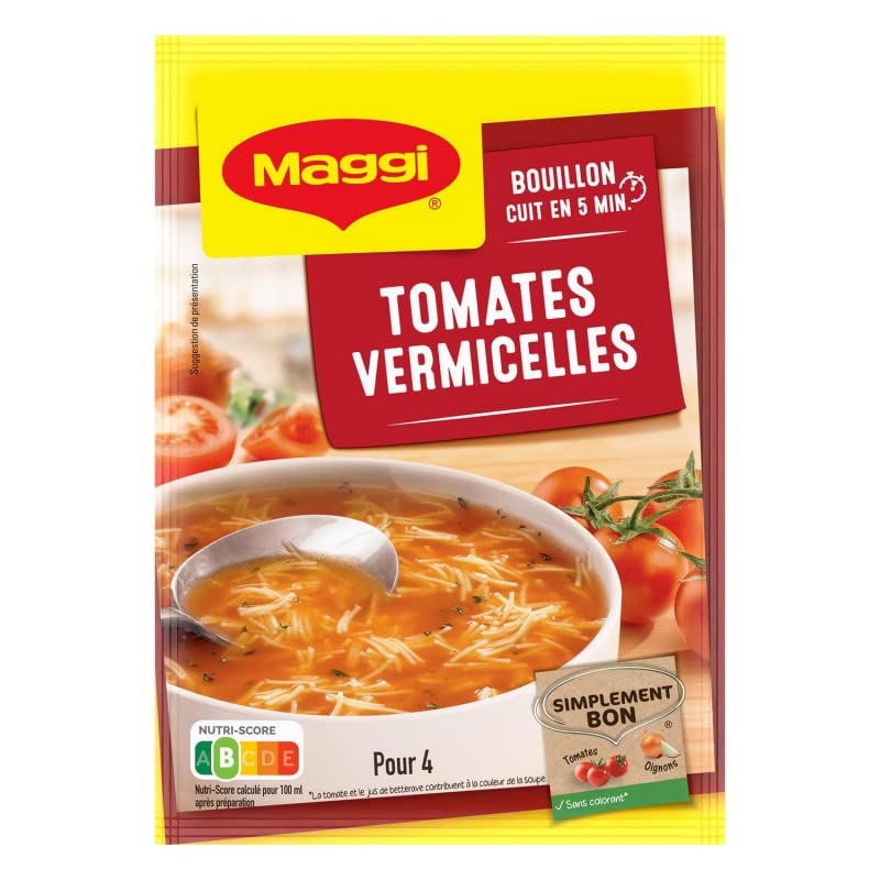 MAGGI's expertise: delicious sun-ripened tomatoes, flavorful vermicelli, a bouquet garni, and just the right amount of salt for a simple and delicious taste. Quick and easy, prepare a tasty tomato and vermicelli soup in just 6 minutes that the whole family will love! INGREDIENTS Ingredients: Vermicelli 37 (durum wheat semolina), wheat flour, tomato 16.6 , salt, starch, sugar, yeast extract, onion 0.8 , sunflower oil, beetroot juice, flavorings, garlic, celery seeds, parsley, white pepper, vinegar, paprika, and celery extracts. May contain: eggs, milk, mustard, fish, crustaceans. INSTRUCTIONS FOR USE ILIWQBiZwriZeziZiZQBiZiZJwOqQB See moreMAGGI - Bouillon Tomates Vermicelles 70G - Lot De 4 - Vendu Par LotDESCRIPTION DU PRODUIT DESCRIPTION DU PRODUIT Le savoir-faire MAGGI: de bonnes tomates mûries au soleil, de délicieux vermicelles, un bouquet garni et juste ce qu'il faut de sel pour un goût simple et savoureux. Pratique et rapide, préparez en 6 minutes seulement une bonne soupe de tomates aux vermicelles qui fera plaisir à toute la famille !. INGRÉDIENTS Ingrédients: Vermicelles 37 (semoule de BLE dur), farine de BLE, tomate 16,6 , sel de cuisine, fécule, sucre, extrait de levure, oignon 0,8 , huile de tournesol, jus de betterave rouge, arômes, ail, graines de CELERI, persil, poivre blanc, extraits de vinaigre, de paprika et de CELERI. Peut contenir : OEUFS, LAIT, MOUTARDE, POISSONS, CRUSTACES. MODE D'EMPLOI ILIWQBiZwriZeziZiZQBiZiZJwOqQB Voir plus