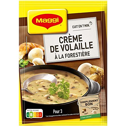 MAGGI's expertise: a smooth soup combining generous pieces of mushrooms, a delicious hint of poultry with a bouquet garni, and just the right amount of salt for a succulent, low-fat recipe. With MAGGI, rediscover all the pleasure of a good, cooked soup, ready in 7 minutes. INGREDIENTS Ingredients: Starch, WHEAT flour, mushrooms 7.6 : button mushrooms 4.6 , porcini mushrooms 3 flavorings (EGGS, MILK, WHEAT), salt, sugar, poultry 3.7 : chicken fat, chicken extract 1.2 sunflower oil, CREAM powder 3.4 , yeast extract, onion 2 , mushroom extract, MILK proteins, parsley, white pepper, garlic, white wine extract, turmeric, antioxidant: rosemary extract. May contain CELERY, FISH, CRUSTACEANS.NESTLE MAGGI - Crème De Volaille Forestière 64G - Lot De 4 - Offre SpecialDESCRIPTION DU PRODUIT DESCRIPTION DU PRODUIT Le savoir-faire MAGGI: une soupe onctueuse alliant de bons morceaux de champignons, une délicieuse note de volaille avec un bouquet garni et juste ce qu'il faut de sel pour une recette succulente et faible en matières grasses. Avec MAGGI, retrouvez tout le plaisir d'une bonne soupe cuisinée, prête en 7 minutes. INGRÉDIENTS Ingrédients: Fécule, farine de BLE, champignons 7,6 : champignons de Paris 4,6 , bolets 3 arômes (OEUFS, LAIT, BLE), sel, sucre, volaille 3,7 : graisse de poulet, extrait de poulet 1,2 huile de tournesol, CREME en poudre 3,4 , extrait de levure, oignon 2 , extrait de champignons, protéines de LAIT, persil, poivre blanc, ail, extrait de vin blanc, curcuma, antioxydant : extraits de romarin. Peut contenir CELERI, POISSONS, CRUSTACES.