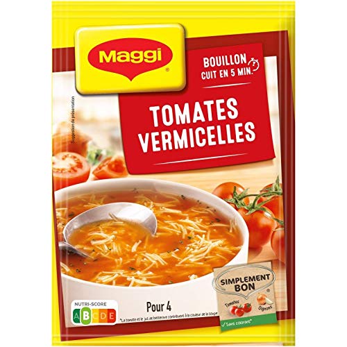 MAGGI's expertise: delicious sun-ripened tomatoes, flavorful vermicelli, a bouquet garni, and just the right amount of salt for a simple and delicious taste. Quick and easy, prepare a tasty tomato and vermicelli soup in just 6 minutes that the whole family will love! INGREDIENTS Ingredients: Vermicelli 37 (durum wheat semolina), wheat flour, tomato 16.6 , salt, starch, sugar, yeast extract, onion 0.8 , sunflower oil, beetroot juice, flavorings, garlic, celery seeds, parsley, white pepper, vinegar, paprika, and celery extracts. May contain: eggs, milk, mustard, fish, crustaceans. INSTRUCTIONS FOR USE ILIWQBiZwriZeziZiZQBiZiZJwOqQB See more
