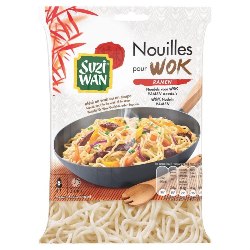 DESCRIPTION DU PRODUIT DESCRIPTION DU PRODUIT Les nouilles ramen précuites Suzi Wan pour réaliser de délicieux woks. Alternative aux pâtes traditionnelles, nos nouilles ramen peuvent être utilisées dans un large choix de recettes et de saveurs asiatiques. Essayez nos nouilles à base de blé, alternative aux pâtes traditionnelles !. INGRÉDIENTS Ingrédients: farine de BLE, eau, GLUTEN de BLE, sel, épaississant (gomme de guar), régulateur d'acidité (glucono-delta-lactone). Peut contenir: SOJA.