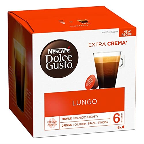 Discover the NESCAFE DOLCE GUSTO Lungo coffee capsule, a long, velvety coffee. All the aromatic richness of an espresso in a larger cup (120 ml), milder and topped with a fine, silky crema . Enjoy this long, smooth coffee with complex aromatic notes of roasted coffee and a subtle hint of blackcurrant. Intensity 6 11. Coffee foam. INGREDIENTS Ingredients: Ground coffee. INSTRUCTIONS FOR USE See more