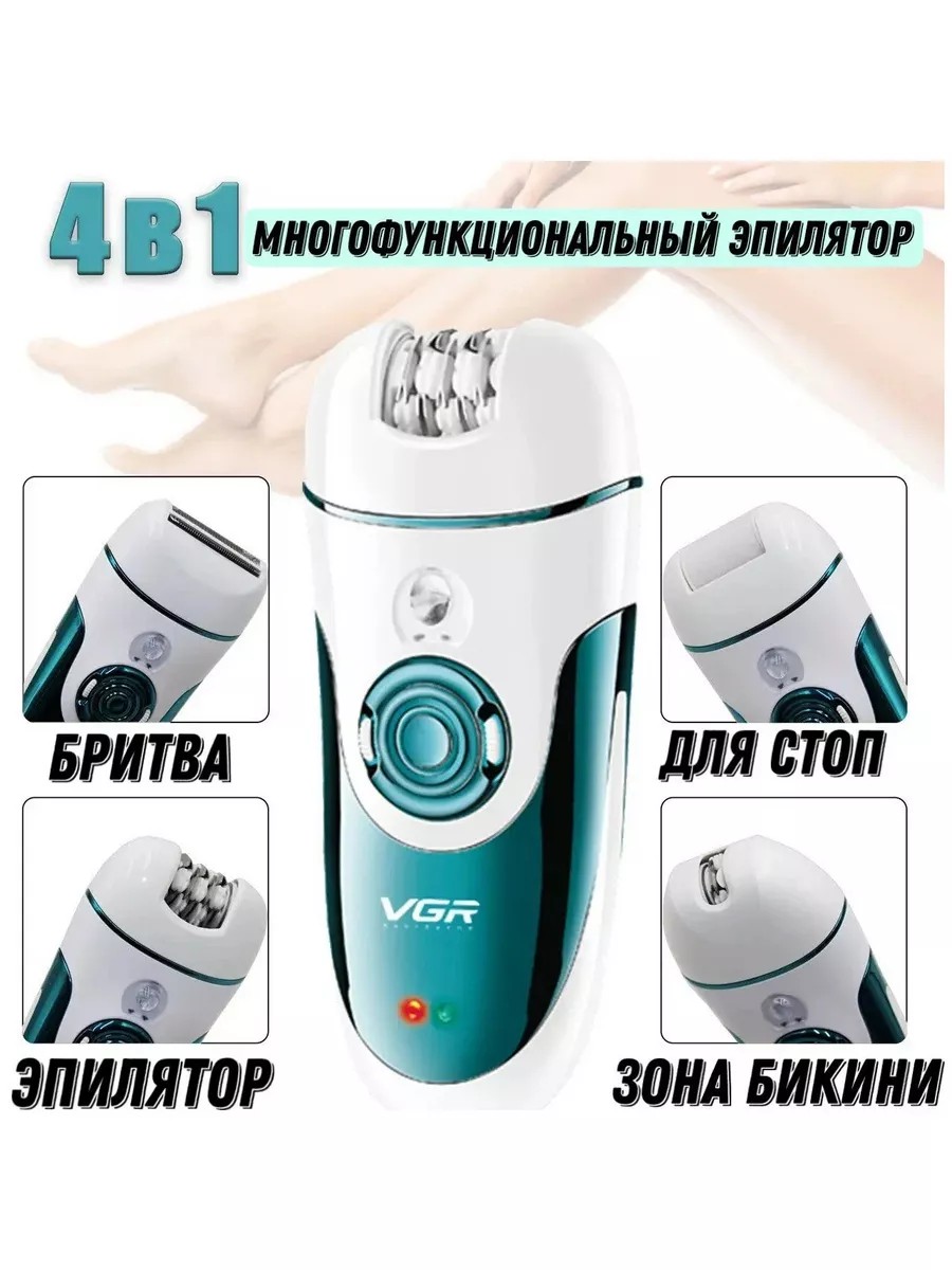 Многофункциональный эпилятор 4в1 VGR V-700 это: полноразмерный эпилятор; узкий эпилятор для подмышек; электробритва; электрическая пилка для пяток.