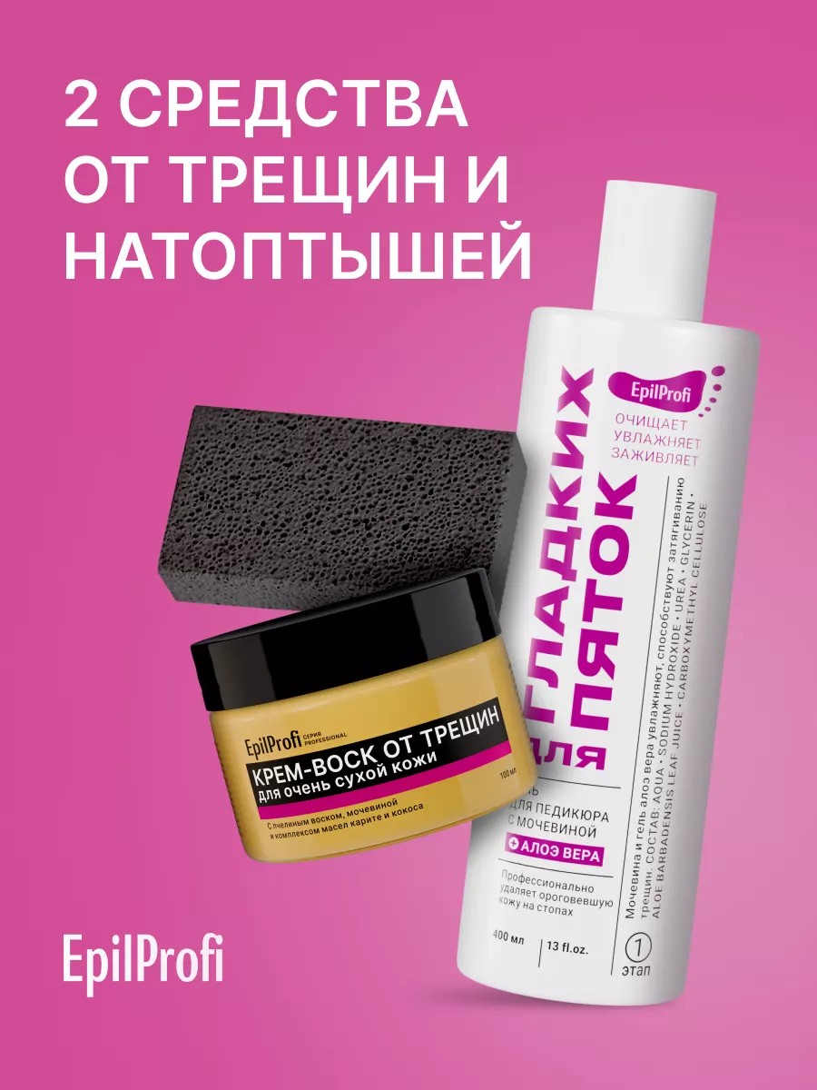 В уходовый набор входит не только крем, также в нём есть специальный гель-кератолитик с мочевиной и алоэ вера, и пемза, которые помогут удалить огрубевшие участки кожи, придадут стопам невероятную гладкость. Сочетание геля, пемзы и крема-воска дарит мощный эффект, который преображает ноги с первого применения!