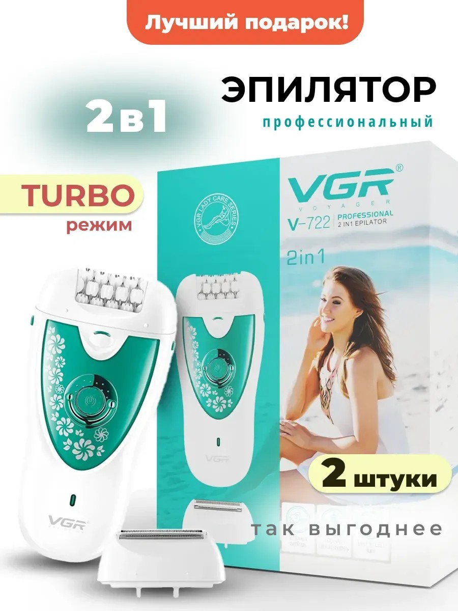 Set of 2. The VGR V-722 2-in-1 Women's Set is a multifunctional device for women: an epilator and a razor with a shaver. Designed to remove unwanted hair from various areas of the body, including the face, bikini area, and underarms. The universal VGR V-722 women's epilator is battery-powered. Its cordless mode allows you to use the device anywhere, without the clutter of wires. A capacious 600 mAh battery provides 50 minutes of continuous operation. It can be easily charged from any device in 1.5 hours. The epilator has 32 tweezers, allowing you to catch all hairs, from the smallest to the most delicate. Its two-way operation allows you to choose the most comfortable mode for you. Its compact size, light weight of just 150 grams, and ergonomic shape make it convenient to use and store. It's easy to hold, ensuring precise movements, especially in hard-to-reach areas. It's convenient to take an epilator with you on travel, vacation, or business trips. How do I choose the right attachment? Women's epilator: Ideal for legs, arms, and the bikini area. Women's razor: Suitable for sensitive areas like underarms and the bikini line. The VGR V-722 epilator is an excellent choice for those who want long-lasting smooth skin. Its versatility and effectiveness make it an indispensable addition to your beauty kit. A great gift for a woman, girlfriend, friend, mother, or daughter.
