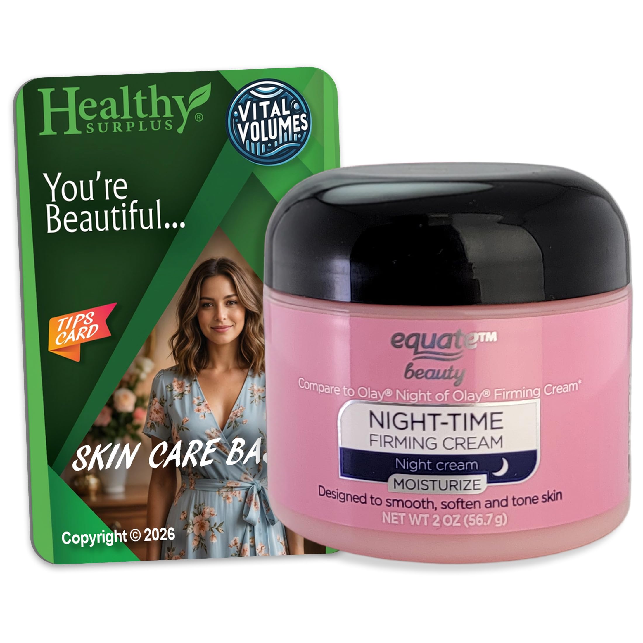 Equate Beauty Night-Time Firming Cream Moisturize - Net Wt 2 Oz (56.7 g) and Vital Volumes Skin Care Basics Tips Card