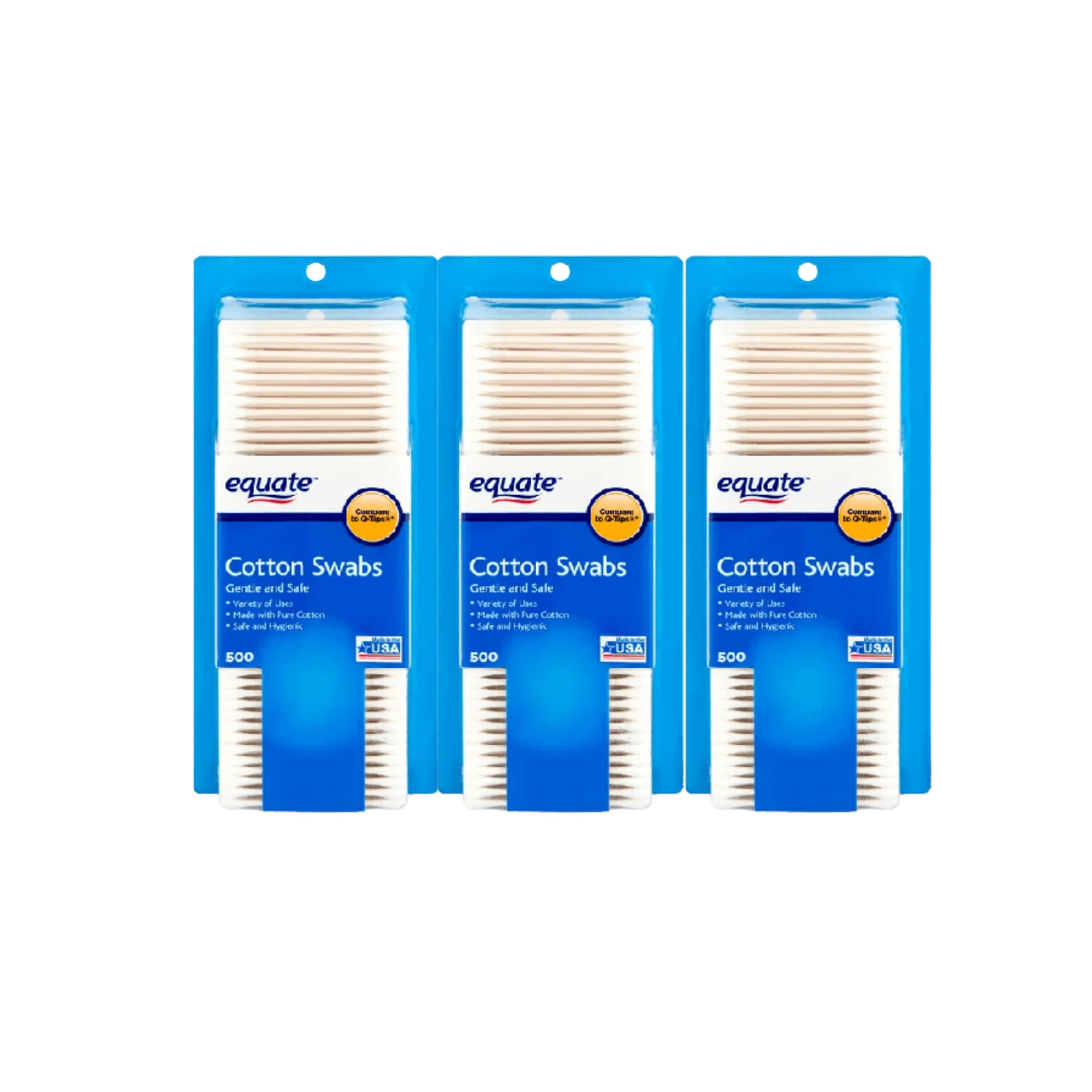 Cotton swabs. Variety of uses. Made of pure cotton. Gentle, hygienic, and safe. Equate Cotton Swabs, 500 count ( Pack of 3 ).