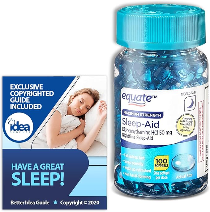 Equate Maximum Strength Sleep-Aid Softgels 50mg, 100 Ct Bundle with Exclusive Have a Great Sleep - Better Idea Guide (2 Items)