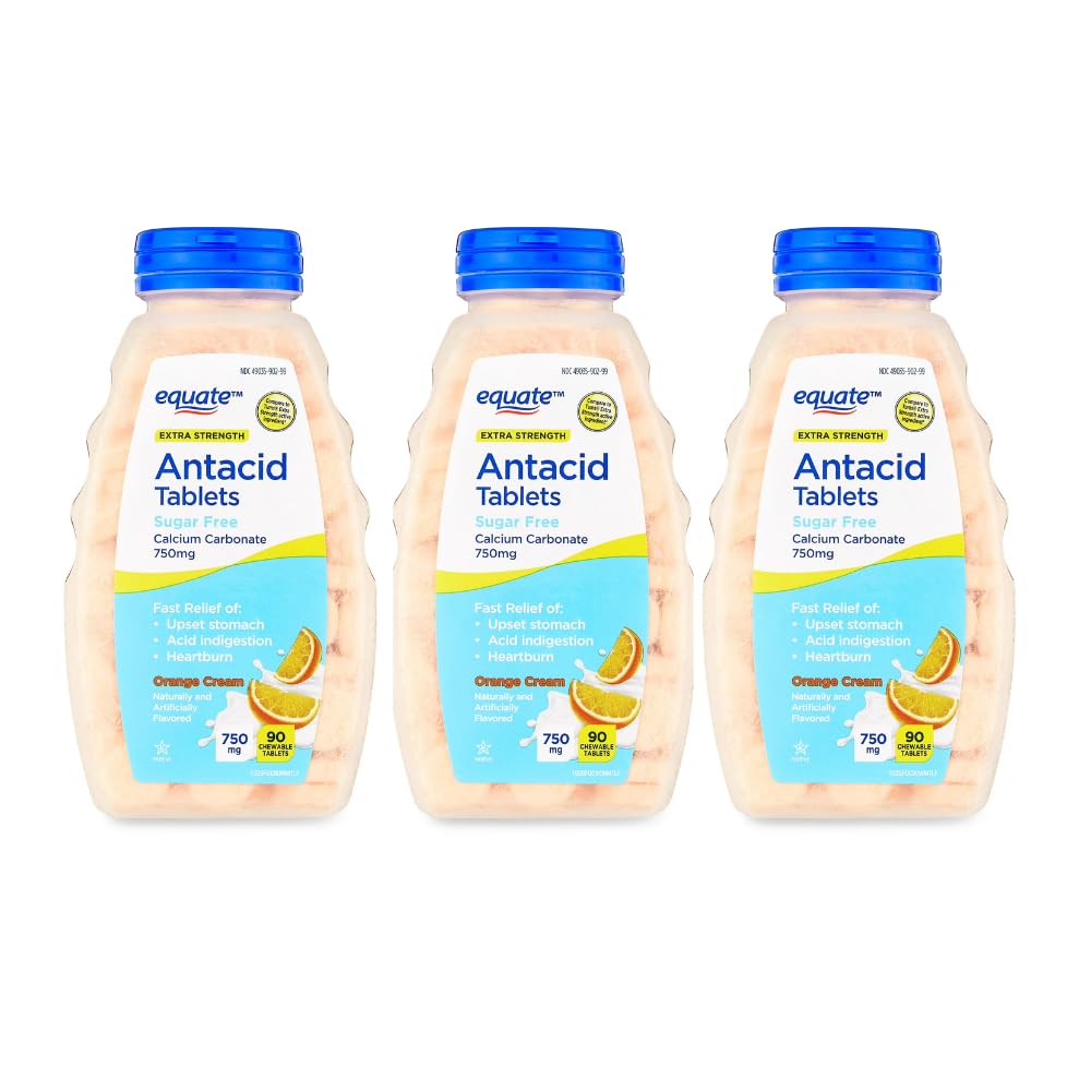 Equate Sugar-Free Antacid Extra Strength Chewable Tablets Orange Cream 750 mg 90 Count (Pack of 3) Total 270 Count