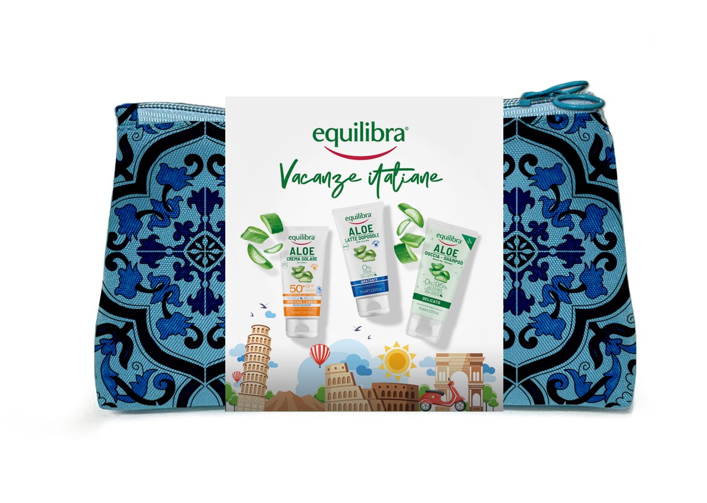 Equilibra Italian Holiday Pouch contains: • 1 Equilibra Aloe Sunscreen SPF 50 which protects even the most delicate and sensitive skin, helping to prevent photoaging and erythema. Vitamin C and vitamin E stimulate the skin's natural defenses. The argan oil, coconut oil, and shea butter in the formula help nourish and moisturize the skin, combating the aging process. With a natural moisturizing complex vitamin E (argan oil coconut oil shea butter). Directions for use: Apply the product before sun exposure. Reapply frequently to maintain protection, especially after breathing, getting wet, or drying off. The sunscreen filters may stain clothing. Warnings for healthier sun exposure: • Do not stay in the sun too long, even while using a sunscreen product. • Keep babies and small children out of direct sunlight. • Excessive sun exposure poses a serious health risk. • Avoid the eye area. In case of contact with eyes, rinse thoroughly. • Avoid contact with fabrics and hard surfaces. • 1 Equilibra Aloe After Sun Lotion is a light, silky lotion that absorbs easily without leaving a greasy residue. It restores hydration and nourishes sun-dehydrated skin, leaving it smooth and radiant. Enriched with carrot oil and vitamin E. Directions for use: Apply to the face and body after sun exposure, on perfectly clean skin. Spread evenly with light massages until completely absorbed. To facilitate emptying, we recommend unscrewing the cap. • 1 Equilibra Aloe Shower Gel is a gentle gel, ideal for daily cleansing of the entire body. Its soft, gentle lather leaves skin perfectly clean and pleasantly scented. With moisturizing aloe vera, soothing glycerin, and refreshing mint water. Directions: Take a small amount of product and apply to damp skin in the shower. Rinse thoroughly with warm water until the product is completely removed. INGREDIENTS Equilibra Aloe Sunscreen SPF 50 : Ingredients: Aloe Barbadensis Leaf Juice, Aqua (Water), Octocrylene, Ethylhexyl Methoxycinnamate, Diethylamino Hydroxybenzoyl Hexyl Benzoate, C12-15 Alkyl Benzoate, Phosphate, Propanediol, Titanium Dioxide, Ixide. Soamyl Laurate, Alumina, Methylene Bis-Benzotriazolyl Tetramethylbutylphenol (Nano), Glycerin, Opuntia Ficus-Indica Stem Extract, Prunus Amygdalus Dulcis (Sweet Almond) Oil, Tocopheryl Alcohol Acetate, Cetyl Palmitate, Sorbitan Stearate, Glyceryl Stearate, Glyceryl Stearate, Glyceryl Acryate ammonium Loyldimethyltaurate Vp Copolymer, Sodium Hyaluronate, Silica, Butyrospermum Parkii (Shea) Butter, Decyl Glucoside, Isopropyl Myristate, Xanthan Gum, Glycine Soja (Soybean) Oil, Dehydroacetic Acid, Ethylhexylglycerin, Tocopherol, Propylene Glycol, Ascorbye. Aloe Barbadensis Leaf Juice, Dr. Aucus Carrot Sativa (Carrot) Root Extract, Hydrolyzed Sweet Almond Protein, Potassium Palmitoyl Hydrolyzed Wheat Protein, Methyl Decenol, Argania Spinosa Kernel Oil, Potassium Sorbate, Lecithin, Undecylenic Acid, Sodium Polyacrylate, Benzyl Alcohol, Sodium Phytate, Sodium Benzoate, PEG-100 Stearate, Beta-Carotene, Citric Acid. Always refer to the formulas on the Equilibra Aloe After-Sun Lotion packaging: Ingredients: Aloe Barbadensis Leaf Juice, Aqua (Water), Ethylhexyl Palmitate, Glycerin, Cetearyl Alcohol, Potassium Cetyl Phosphate, Cetyl Palmitate, Parfum (Fragrance), Caprylic Capric Triglyceride, Cetearyl Isononanoine. Date, Dicaprylyl Ether, Propanediol, Butyrospermum Parkii (Shea) Butter, Hydrolyzed Sweet Almond Protein, Potassium Palmitoyl Hydrolyzed Wheat Protein, Tocopheryl Acetate Opuntia Ficus-Indica Stem Extract, Prunus Amygdalus Dulcis (Sweet Almond) Oil, Daucus Carotte Sativa (Carrot) Root Extract, Menthyl Lactate, Ascorbyl Palmitate, Argania Spinosa Kernel Oil, Tapioca Starch, Allantoin, in, Undecyll Sodium acid, potassium benzoate, sorbate, citric acid. Always refer to the formulas on the Equilibra Aloe Shower Shampoo packaging: Ingredients: Aqua (Water), Ammonium Lauryl Sulfate, Cocamidopropyl Betaine, Glycerin, Glyceryl Oleate, Coco-Glucoside, Aloe Barbadensis Leaf Juice, Mentha Piperita (Peppermint) Leaf Water, Tocopherol, Citric Acid, Sodium Chloride, Lactic Acid, Hydrogenated Palm Glycerides Citrates, Sodium Benzoate, Potassium Sorbate, Phenoxyethanol, Benzoic Acid, CI 19140 (Yellow 5), CI 42090 (Blue 1), Parfum (Fragrance). Always refer to the formulas on the packaging. INSTRUCTIONS FOR USE Instructions for use (French not guaranteed) SAFETY WARNING Equilibra Aloe Sunscreen SPF 50 : For external use only. Warnings for healthier sun exposure: • Do not stay in the sun too long, even while using a sunscreen product. • Keep babies and small children out of direct sunlight. • Excessive sun exposure is a serious health risk. • Avoid the eye area if product gets into the eyes, rinse thoroughly. • Avoid contact with fabrics and hard surfaces. Equilibra Aloe After-Sun Lotion: For external use only. Equilibra Aloe Shower Shampoo: For external use only. See moreEQUILIBRA: For over thirty years, a market leader in natural food supplements and cosmetics, with products that balance respect, effectiveness, well-being, and beauty. Aloe After-Sun and Shower Shampoo: Complete your summer routine with aloe after-sun lotion enriched with carrot oil and vitamin E, and aloe shower shampoo, ideal for daily cleansing. Sunscreen SPF 50 : Contains a natural moisturizing complex vitamin E (argan oil coconut oil shea butter), and a high concentration (40 ) of aloe vera. Features: The pouch, made from recycled R-Pet material, is available in two designs and contains dermatologically tested, travel-sized products suitable for sensitive skin. Italian Travel Pouch: Contains 1 Aloe Sunscreen SPF 50 , 1 Aloe After-Sun Lotion, and 1 Aloe Shower Shampoo.equilibra, Pochette de vacances italienne, avec Aloe Crème Solaire SPF 50 , Aloe Lait Après-Soleil et Aloe Douche-Shampoing, en Format Pratique de Voyage, Testé dermatologiquement, Convient aux peauxDESCRIPTION DU PRODUIT DESCRIPTION DU PRODUIT Equilibra Pochette Vacances Italienne