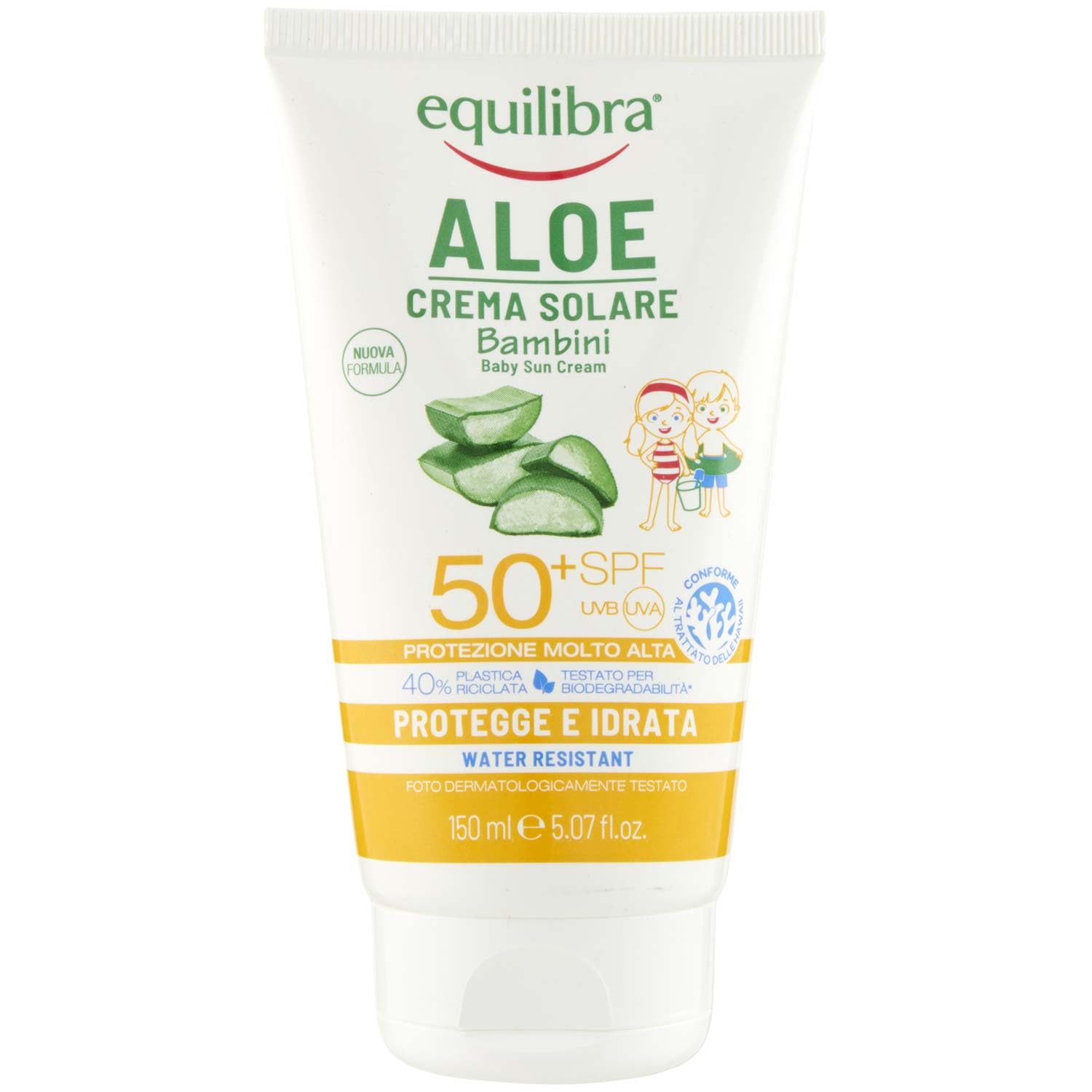 Equilibra Aloe Children's Sunscreen SPF 50 is formulated for children's delicate skin. It provides natural protection against sunburn and sunburn thanks to a balanced combination of UVA and UVB filters. The high concentration of Aloe Vera (40 ) moisturizes, refreshes, and soothes the skin while offering enhanced protection, with a natural moisturizing complex and vitamin E (argan oil, coconut oil, and shea butter). Directions: Apply the product before sun exposure. Reapply frequently to maintain protection, especially after breathing, getting wet, or drying off. The sunscreen filters may stain clothing. SPF 50 very high protection. Dermatologically tested. Waterproof. Protects and hydrates. Contains Prosun UV Sea Respect Complex with maximum photostability and protection, and an anti-spot complex, active anti-spot formula (red orange, olive, caper, and rice) vitamin C filtering complex, with a natural moisturizing complex vitamin E (argan oil coconut oil shea butter). INGREDIENTS Ingredients: Aloe Barbadensis Leaf Juice, Octocrylene, Aqua (Water), Diethylamino Hydroxybenzoate, Ethylhexyl Triazone, Methylene Bis-Benzotriazolyl Tetramethylbutylphenol (Nano), C12-15 Alkyl Benzoate, Glycerin, Potassium C12-C15. ethyl phosphate, Caprylic Capric Triglyceride, Ethylhexyl Palmitate, Bis-Ethylhexyloxyphenol Methoxyphenyl Triazine, Cetyl Palmitate, Cetearyl Alcohol, Sorbitan Stearate, Cetyl Alcohol, Coco-Caprylate, Butyrospermum Parkii (Shea) Butter, Argania Spinosa Kernel Oil, Cocos Nucici sera (Coconut) Oil, Tocopheryl Acetate Tocopherol, Ascorbyl Palmitate, Oat Sativa (Oat) Kernel Extract, Oryza Sativa (rice) Extract, Oryzanol, Phenoxyethanol, Parfum (Fragrance), Decyl Glucoside, Xanthan Gum, Ammonium Acryloyldimethyltaurate Vp Copolymer, Ethylylylhexylglycerin, undecylenic acid, sodium phytate, lecithin propylene glycol, citric acid, Helianthus Annuus (Sunflower) Seed Oil, Sodium Benzoate. Always refer to the ingredients on the packaging. SAFETY WARNING For external use only. See moreEQUILIBRA: For over thirty years, a market leader in natural food supplements and cosmetics, with products that balance respect, effectiveness, well-being, and beauty. Protects and hydrates: For even coverage, we recommend frequent reapplication to maintain protection, especially after breathing, getting wet, or drying off. Contents: Contains a natural moisturizing complex vitamin E (argan oil coconut oil shea butter), and Equilibra Aloe Vera. Features: Aloe vera balances, hydrates, refreshes, and soothes the skin while providing enhanced protection. To protect children's skin: Designed for children's delicate skin, it naturally protects against burns and sunburn thanks to the balanced combination of UVA and UVB filters.equilibra Solari, Aloe Crème Solaire Enfants SPF 50 , Crème Solaire Peaux Délicates à Base d'Aloe Vera, Huile d'Argan, Huile de Coco, Beurre de Karité et Vitamine E, Water Resistant, 150 mlDESCRIPTION DU PRODUIT DESCRIPTION DU PRODUIT Équilibra Aloe Crème Solaire Enfants SPF 50 étudié pour la peau délicate des enfants, protège de manière naturelle contre les brûlures et les érythèmes solaires grâce à l'association équilibrée des filtres UVA et UVB. L'Aloe Vera équilibre, contenue en quantités importantes (40 ), hydrate, rafraîchit et soulage la peau tout en offrant une protection renforcée, avec complexe hydratant naturel vitamine E (huile d'argan huile de coco beurre de karité). Mode d'emploi : appliquer le produit avant l'exposition. Réappliquer fréquemment pour maintenir la protection surtout après avoir respirant ou après s'être mouillé ou séché. Les filtres solaires présents peuvent tacher les vêtements. SPF 50 très haute protection. Testé dermatologiquement. Étanche Protège et hydrate Contient Prosun UV Sea Respect Complex avec une photostabilité et une protection maximales, et un complexe anti-tache, actif anti-tache (orange rouge, olive, câvre et riz) vitamine C complexe filtrant, avec complexe hydratant naturel vitamine E (huile d'argan huile de coco beurre de karité). INGRÉDIENTS Ingrédients : Aloe Barbadensis Leaf Juice, Octocrylene, Aqua (Water), Diethylamino Hydroxybenzoate, Ethylhexyl Triazone, Methylene Bis-Benzotriazolyl Tetraméthylbutylphenol (Nano), C12-15 Alkyl benzoate, Glycerin, potassium C12-C15. éthyl phosphate, Caprylic Capric Triglyceride, Ethylhexyl Palmitate, Bis-Ethylhexyloxyphenol Methoxyphenyl Triazine, Cetyl Palmitate, Cetearyl Alcohol, Sorbitan Stéarate, Cetyl Alcohol, Coco-Caprylate, Butyrospermum Parkii (Shea) Butter, Argania Spinosa Kernel Oil, Cocos Nucici fera (Coconut) Oil, Tocopheryl Acétate de Tocopherol, Ascorbyl Palmitate, Avoine Sativa (Oat) Kernel Extract, Oryza Sativa (rice) Extract, Oryzanol, Phenoxyethanol, Parfum (Fragrance), Décyl Glucoside, Xanthane Gum, Ammonium Acryloyldimethyltaurate Vp Copolymer, Ethylylylhexylglycerin, acide undécylenic, sodium phytate, lécithin, propylène glycol, acide citrique, Helianthus Annuus (Sunflower) Seed Oil, Sodium benzoate. Se référer toujours aux formules figurant sur les emballages AVERTISSEMENT DE SÉCURITÉ Usage extérieur uniquement. Voir plusEQUILIBRA: Depuis plus de trente ans, leader sur le marché Compléments alimentaires et cosmétiques naturels avec produits issus de l'équilibre entre respect, efficacité, bien-être et beauté. Protège et hydrate : pour un effet uniforme, nous vous recommandons de réappliquer avec fréquence pour maintenir la protection surtout après avoir respirant ou après avoir été mouillé ou séché. Contenu : contient du complexe hydratant naturel de la vitamine E (huile d'argan huile de coco beurre de karité), Aloe Vera Equilibra. Caractéristiques : l'aloe vera équilibre, hydrate, rafraîchit et soulage la peau tout en offrant une protection renforcée. Pour protéger la peau des enfants : étudiée pour la peau délicate des enfants, protège de manière naturelle contre les brûlures et les érythèmes solaires gr