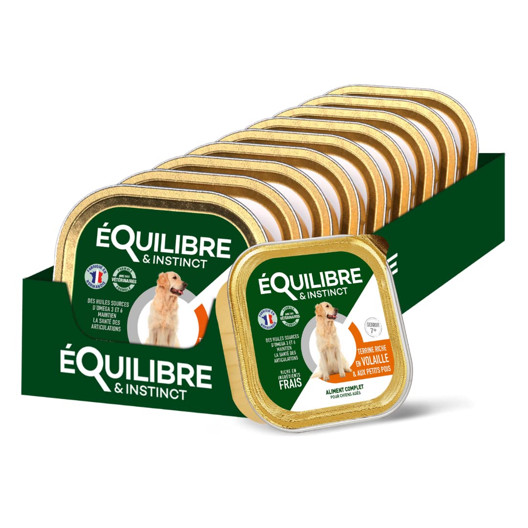 Our poultry-rich pâtés for older dogs are specially adapted to their age and nutritional needs. They contain oils that are sources of omega 3 and 6, which help maintain the health of the animal's joints. In addition, the humidity of the mash guarantees your animal optimal natural hydration. Vitamin E is present in this recipe for its antioxidant action favorable to maintaining natural defenses. Taurine helps maintain vision. The dog can synthesize it but requires a minimum supplementary intake which comes through food. Pork, present in our pâtés in fresh and frozen form, constitutes a source of protein of animal origin, which makes it possible to improve the quantity and quality, and which has the virtue of greatly improving the animal's digestion. Poultry contained in fresh form constitutes a source of high quality proteins and amino acids which contribute to the development, strengthening and maintenance of your companion's muscles. It is recommended to adapt the quantity according to the activity, breed and age of your dog. After opening, store in the refrigerator ( 4 C). BALANCE INSTINCT is the first brand dedicated to the well-being of cats and dogs. All our recipes are prepared in France, using fresh and natural ingredients adapted to the metabolism of our four-legged companions. INGREDIENTS Poultry 27 (including 27 fresh), Pork 22 (including 17 fresh), Peas 4 , Glycine, Beet pulp 0.47 , Sunflower oil 0.37 , Minerals, Dextrose, Fish oil 0.11 . Natural ingredients. DIRECTIONS FOR USE Serve at room temperature. After opening, store in the refrigerator and consume within 48 hours. BALANCE INSTINCT: Developed with veterinarians and animal dietetic experts, our formulas promote optimal digestibility and proper urinary system function for animals in great shape, at every stage of their lives. MADE IN FRANCE: Established for 30 years in the heart of the Normandy countryside, we produce quality food for your four-legged friends. We favor short supply chains to guarantee the freshness and quality of our ingredients. QUALITY INGREDIENTS: This recipe contains 85 animal-based proteins, known for their high digestibility. It also includes 27 fresh poultry and 17 fresh pork. FORMULATED FOR SENIOR DOGS: These pâtés, rich in poultry and peas, contain taurine, which helps maintain vision, as well as omega 3 and 6, which contribute to joint health. COMPLETE, WET FOOD: This poultry-rich senior dog food is specially tailored to the nutritional needs of older dogs. The moisture in this food also ensures optimal hydration for your pet. Nos pâtées riches en volaille pour chien âgé sont spécialement adaptées à leur âge et à leurs besoins nutritionnels. Elles contiennent des huiles sources d'oméga 3 et 6, qui contribuent à maintenir la santé des articulations de l'animal. De plus, l'humidité de la pâtée garantie à votre animal une hydratation naturelle optimale. La vitamine E est présente dans cette recette pour son action antioxydante favorable au maintien des défenses naturelles. La taurine quant à elle aide au maintien de la vision. Le chien peut en synthétiser mais nécessite apport complémentaire minimum qui passe par le biais de l'alimentation. Le porc, présent dans nos pâtées sous forme fraîche et congelée constitue une source de protéines d'origine animale, ce qui permet d'en améliorer la quantité et la qualité, et qui a comme vertu d'améliorer grandement la digestion de l'animal. La volaille contenue sous forme fraîche constituent une source de protéines et d'acides aminés de haute qualité qui contribuent au développement, au renforcement et au maintien des muscles de votre compagnon. Il est recommandé d'adapter la quantité selon l'activité, la race et l'âge de votre chien. Après ouverture, conserver au réfrigérateur ( 4 C). ÉQUILIBRE INSTINCT est la première marque dédiée au bien-être des chats et des chiens. Toutes nos recettes sont préparées en France, à partir d'ingrédients frais et naturels adaptés au métabolisme de nos compagnons à quatre pattes. INGRÉDIENTS Volaille 27 (dont 27 de frais), Porc 22 (dont 17 de frais), Petits pois 4 , Glycine, Pulpe de betterave 0.47 , Huile de tournesol 0.37 , Minéraux, Dextrose, Huile de poisson 0.11 . Ingrédients naturels. MODE D'EMPLOI Servir à température ambiante. Après ouverture, conserver au réfrigérateur et consommer dans les 48 heures. ÉQUILIBRE INSTINCT : Élaborées avec des vétérinaires et des experts en diététique animale, nos formulations favorisent une digestibilité optimale et un bon fonctionnement du système urinaire pour des animaux en pleine forme, à chaque étape de leur vie. FABRIQUÉ EN FRANCE : Installé depuis 30 ans au cœur du bocage Normand, nous produisons une alimentation de qualité pour vos compagnons à quatre pattes. Nous privilégions un approvisionnement en circuit court pour garantir la fraîcheur et la qualité de nos ingrédients. INGRÉDIENTS DE QUALITÉ : Cette recette contient 85 de protéines d'origine animale, connues pour leur haute digestibilité. Elle comporte d'ailleurs 27 de volaille fraîche et 17 de porc frais. FORMULÉE POUR LES CHIENS AGÉS : Ces pâtées riches en volaille et aux petits pois contiennent de la taurine qui aide au maintien de la vision, ainsi que des oméga 3 et 6 qui contribuent à la santé des articulations. NOURRITURE COMPLÈTE ET HUMIDE : Cette pâtée pour chien senior riche en volaille est spécialement adaptée aux besoins nutritionnels du chien âgé. De plus, l'humidité de cet aliment garantit à votre animal une hydratation optimale.