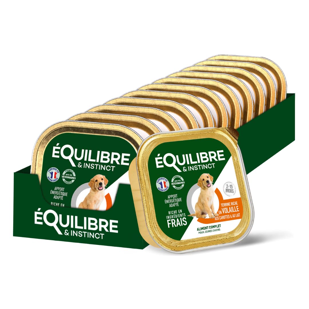BALANCE INSTINCT: Developed with veterinarians and animal dietetic experts, our formulas promote optimal digestibility and proper urinary system function for animals in great shape, at every stage of their lives. MADE IN FRANCE: Established for 30 years in the heart of the Normandy countryside, we produce quality food for your four-legged friends. We favor short supply chains to guarantee the freshness and quality of our ingredients. QUALITY INGREDIENTS: This recipe contains Zinc, which promotes a beautiful coat, as well as high-quality amino acids that contribute to the development, strengthening, and maintenance of muscles. PROMOTES PROPER BRAIN DEVELOPMENT: In these pâtés rich in poultry and carrots, the omega 3 (EPA and DHA) naturally provided by fish oil promote the proper development of the puppy's brain. SUPPORTS GROWTH: Our poultry and carrot-rich pâtés provide an energy intake specially adapted to the proper nutrition of puppies and the needs of a growing dog.ÉQUILIBRE INSTINCT : Élaborées avec des vétérinaires et des experts en diététique animale, nos formulations favorisent une digestibilité optimale et un bon fonctionnement du système urinaire pour des animaux en pleine forme, à chaque étape de leur vie. FABRIQUÉ EN FRANCE : Installé depuis 30 ans au cœur du bocage Normand, nous produisons une alimentation de qualité pour vos compagnons à quatre pattes. Nous privilégions un approvisionnement en circuit court pour garantir la fraîcheur et la qualité de nos ingrédients. INGRÉDIENTS DE QUALITÉ : Cette recette contient du Zinc qui favorise la beauté du pelage ainsi que des acides aminés de haute qualité qui contribuent au développement, au renforcement et au maintien des muscles. FAVORISE LE BON DÉVELOPPEMENT DU CERVEAU : Dans ces pâtées riches en volaille et aux carottes, les oméga 3 (EPA et DHA) apportés naturellement par l'huile de poisson favorisent le bon développement du cerveau du chiot. SOUTIENT LA CROISSANCE : Nos pâtées riches en volaille et aux carottes offrent un apport énergétique spécialement adapté à la bonne alimentation du chiot et aux besoins d'un chien en pleine croissance.