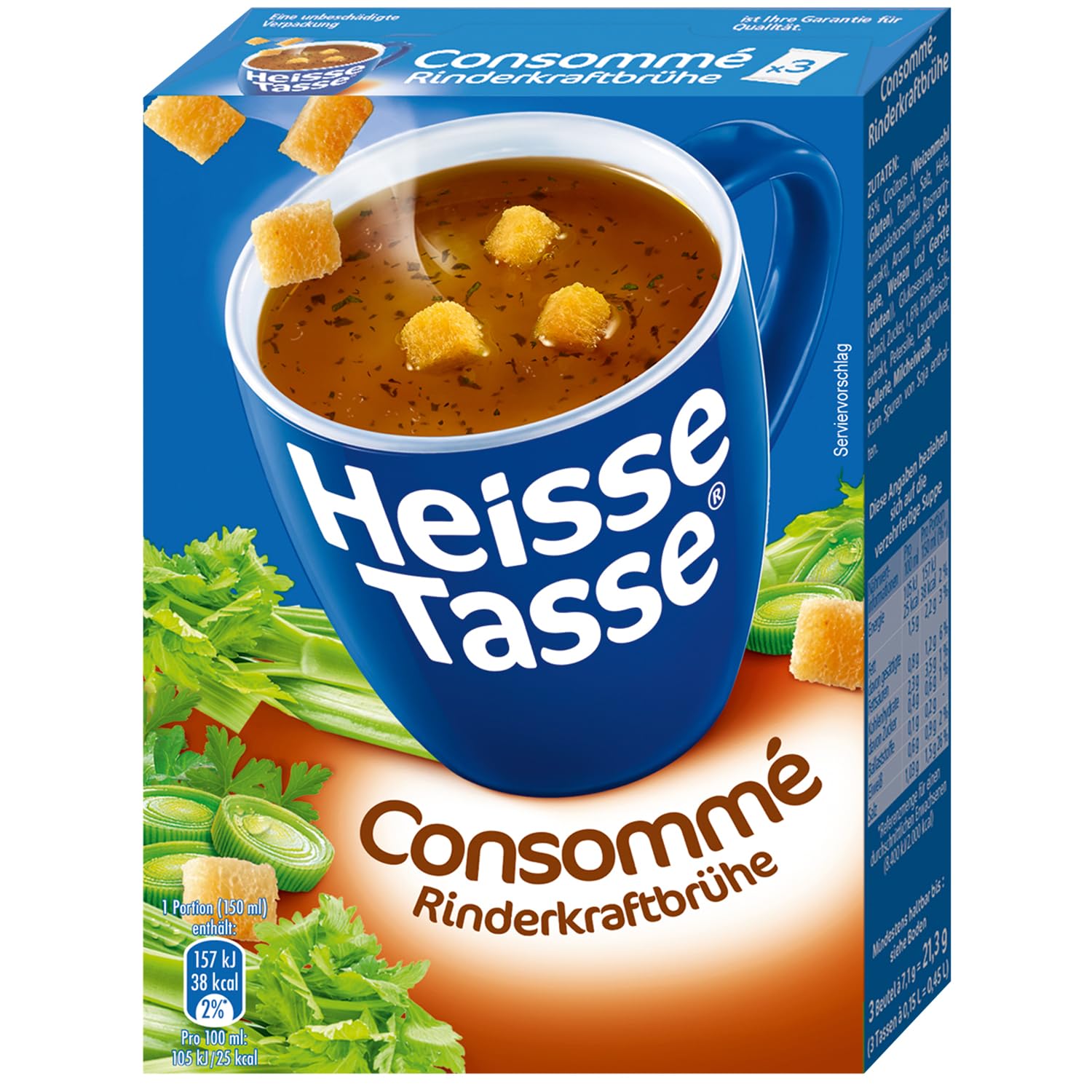 With full strength against the midday low!No matter where it surprises you, we have something against the hunger hole in your stomach: namely the hot cup of consecommé cattle broth!The hearty taste in a cup makes tired (and hungry) people lively and that in no time at all.Treat your hunger a break Ingredients ingredients Ingredients: 45 croutons (wheat flour, unadorned palm oil, salt, yeast, antioxidant: rosemary extract), aroma (contains barley and celery), glucose syrup, yodet salt, palm oil, sugar, yeast extract (contains barley), 1.6 beef extract, parsley,Leek powder, celery, milk protein.Can contain traces of soy. Instructions 1. Put the bag content in a cup and add 150ml of boiling water.2. Stir vigorously and let it steep for 2 minutes. Warnings Can contain traces of soy. Address manufacturer importer Postfach 12 11 62, D-23532 Lübeck MoreQuality and taste in a cup: we have out what has to be in: really good taste and gently prepared, high -quality ingredients.Practical and uncomplicated whether at work, at home or on vacation - the hot cup of consumption cattle broth simply tastes everywhere.So easy, so fast, so tasty!.Fast against the low of hunger: no time, but still does the stomach reportThen the hot cup of consecommé beef broth is right: in just 2 minutes it defeats every stomach growl!.Free of taste-reinforcing additives: Our consecration brewing broth is prepared gently and carefully.A delicious soup snack doesn't need more.Mit voller Kraft gegen das Mittagstief! Egal, wo es dich überrascht, wir haben was gegen das Hungerloch in deinem Magen: nämlich die Heisse Tasse Consommé-Rinderkraftbrühe! Der herzhafte Geschmack in einer Tasse macht müde (und hungrige) Menschen munter und das im Handumdrehen. Gönn deinem Hunger eine Pause INHALTSSTOFFE ZUTATEN Zutaten: 45 Croûtons (WEIZENMEHL, ungehärtetes Palmöl, Salz, Hefe, Antioxidationsmittel: Rosmarinextrakt), Aroma (enthält GERSTE und SELLERIE), Glukosesirup, Jodsalz, Palmöl, Zucker, Hefeextrakt (enthält GERSTE), 1,6 Rindfleischextrakt, Petersilie, Lauchpulver, SELLERIE, MILCHEIWEIß. Kann Spuren von Soja enthalten. GEBRAUCHSANWEISUNG 1. Beutelinhalt in eine Tasse geben und 150ml kochendes Wasser hinzugeben. 2. Kräftig umrühren und 2 Min. ziehen lassen. WARNHINWEISE Kann Spuren von Soja enthalten. ANSCHRIFT HERSTELLER IMPORTEUR Postfach 12 11 62, D-23532 Lübeck MehrQUALITÄT UND GESCHMACK IN EINER TASSE: Wir haben raus, was rein muss: echt guter Geschmack und schonend zubereitete, hochwertige Zutaten. PRAKTISCH UND UNKOMPLIZIERT Ob auf der Arbeit, zuhause oder im Urlaub - die Heisse Tasse Consommé-Rinderkraftbrühe schmeckt einfach überall. So einfach, so schnell, so lecker!. SCHNELL GEGEN DAS HUNGERTIEF: Keine Zeit, aber dennoch meldet sich der BauchDa kommt die Heisse Tasse Consommé-Rinderkraftbrühe grade richtig: In nur 2 Minuten besiegt sie jedes Magenknurren!. FREI VON GESCHMACKSVERSTÄRKENDEN ZUSATZSTOFFEN: Unsere Consommé-Rinderkraftbrühe wird schonend und sorgfältig zubereitet. Mehr braucht ein leckerer Suppen-Snack nicht.Erasco Tasse Consommé - Rinderkraftbrühe 12x 21.3g