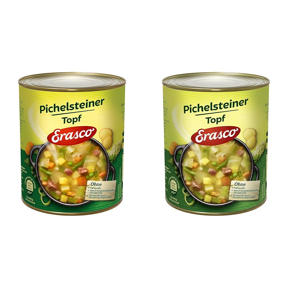 Ingredients ingredients Water, 17 white cabbage, potatoes, 11 carrots, 3.8 leek, 3.1 green beans, 2.6 peas, 1.7 cooked beef (beef, strength, salt), 1.7 Kasseler(Pork, water, salt, dried glucose syrup, stabilizer: diphosphate, aroma, dextrose, antioxidant: sodium ascorbate, rapeseed oil, smoke), salt, sugar, aromas (contains celery) Dextrose, spices, antioxidants ascorbic acid, acidic citric acid, thickener thickener.Can contain traces of wheat, milk, soy, mustard and egg. Instructions Put the content in a suitable shell and heat.600 W approx. 6 min. Warm the content slowly in the pot, stir occasionally. Warnings Contains wheat, soy and celery Morewith natural sea salt.without preservatives according to law.without synthetic colouring.Without flavor enhancing additives.Of course delicious.The following information applies to each unit per pack.INHALTSSTOFFE ZUTATEN Wasser, 17 Weißkohl, Kartoffeln, 11 Möhren, 3,8 Porree, 3,1 grüne Bohnen, 2,6 Erbsen, 1,7 gegartes Rindfleisch (Rindfleisch, Stärke, Salz), 1,7 Kasseler (Schweinefleisch, Wasser, Salz, getrockneter Glucosesirup, Stabilisator: Diphosphate, Aroma, Dextrose, Antioxidationsmittel: Natriumascorbat, Rapsöl, Rauch), Salz, Zucker, Aromen (enthält SELLERIE) Dextrose, Gewürze, Antioxidationsmittel Ascorbinsäure, Säuerungsmittel Citronensäure, Verdickungsmittel Guarkernmehl. Kann Spuren von WEIZEN, MILCH, SOJA, SENF und EI enthalten. GEBRAUCHSANWEISUNG Inhalt in eine geeignete Schale geben und erwärmen. 600 W ca. 6 Min. Inhalt langsam im Topf erwärmen, gelegentlich umrühren. WARNHINWEISE enthält Weizen, Soja und Sellerie Mehrmit natürlichem Meersalz. ohne Konservierungsstoffe lt. Gesetz. ohne künstliche Farbstoffe. ohne geschmacksverstärkende Zusatzstoffe. natürlich lecker. Die folgenden Informationen gelten für jede Einheit pro Packung.Erasco Pichelsteiner Topf (1 x 800 g Dose) (Packung mit 2) 1 800 g (2er Pack)