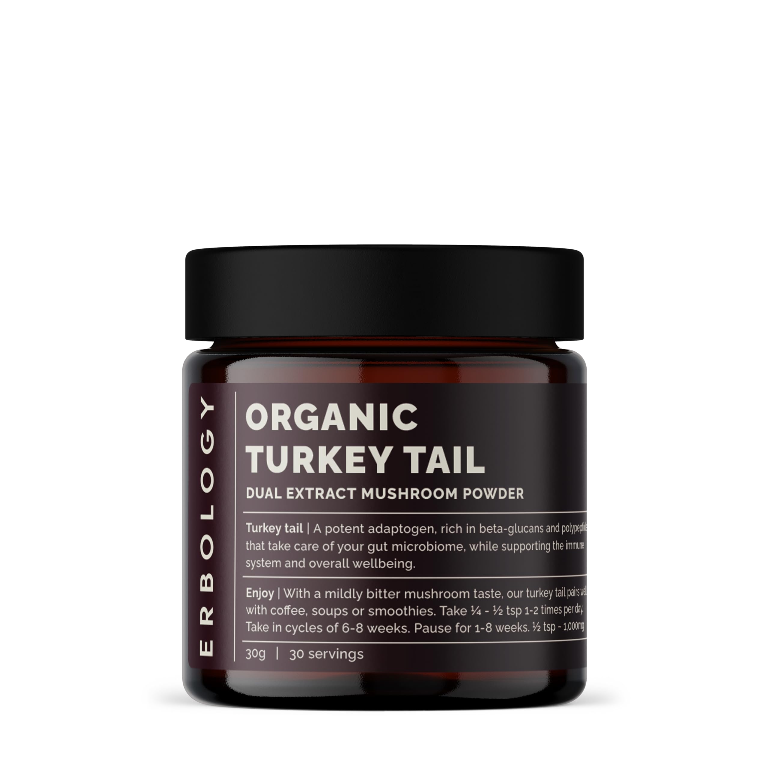 PRO TIP: Indulge in ¼ - ½ teaspoon (500 - 1000mg) by incorporating it into a soothing drink, such as hot chocolate or a smoothie for a convenient and healthful boost. DUAL EXTRACT: Concentrated in soluble beta-glucans, polypeptides, and secondary metabolites. WHY CHOOSE ERBOLOGY: Our 100 pure turkey tail extract is the outcome of two decades of research and development funded by EU grants. Cultivated in small batches under controlled organic conditions in Europe, it undergoes quality verification by independent accredited testers. TASTE: Exhibiting a mildly bitter mushroom taste. NUTRIENT COMPOSITION: Enriched with over 30 immunity-supporting polysaccharides, including 8 soluble beta-glucans and polypeptides such as PSP and PSK, along with secondary metabolites like mycosterols and polyphenols. IDEAL FOR: Supporting your gut health and fortifying your natural immune defenses.