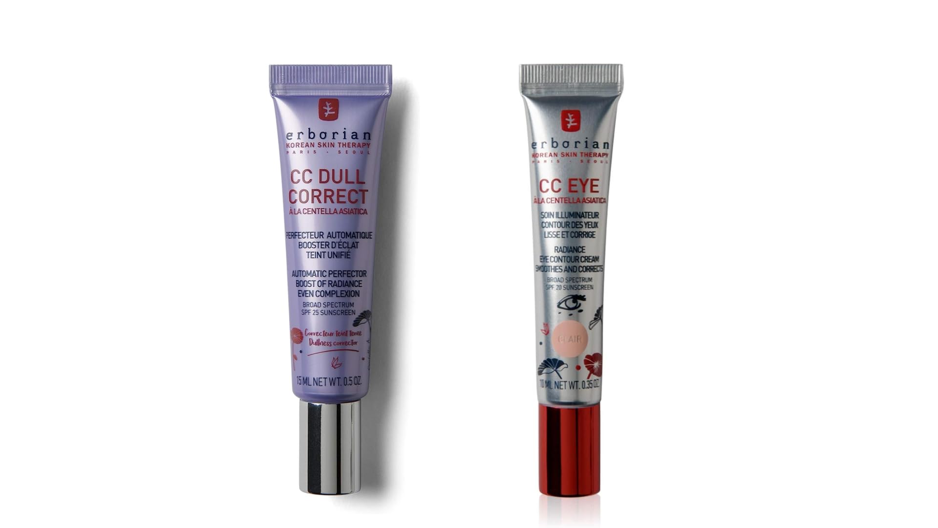 Product 2: HOW TO USE: Applying CC Dull Correct is easy. Use it as a makeup base before foundation, or on its own as a complexion product. Apply a thin layer to your face, avoiding the eye area. When the purple pigments burst, they turn beige gold and blend perfectly with your skin tone. Product 2: SUITABLE FOR ALL SKIN TYPES: Made in Korea, this cream is suitable for all skin types, including sensitive skin. Dermatologically tested. Product 2: KEY INGREDIENTS AND BENEFITS: Enriched with Centella Asiatica, this face cream helps to brighten and hydrate while enhancing your complexion. Its purple formula adapts to your skin tone and helps to instantly conceal dull or tired complexions, thanks to its color-correcting effect. Your complexion is awakened, your skin is visibly more beautiful and radiant. Product 2: A MULTI-PURPOSE COMPLEXION PERFECTOR: Erborian's CC Dull Correct Cream helps automatically correct dullness thanks to the concealing action of its violet pigments, and helps even out skin tone and blur imperfections with its encapsulated pigments. Product 1: KEY INGREDIENTS AND BENEFITS: This concealer contains Tiger Grass (Centella Asiatica) extract, which helps soothe the skin, prevent the appearance of signs of aging, improve skin elasticity, and enhance skin firmness. Our formula also contains a complex of Tara fruit and red algae extracts, and an anti-fatigue peptide that reduces wrinkles and combats under-eye bags and dark circles by improving skin elasticity. Product 1: A MULTI-PURPOSE EYE CREAM: Erborian CC Eye Cream is a 3-in-1 illuminating eye cream that helps hydrate and smooth wrinkles and fine lines, instantly conceal the appearance of puffiness and dark circles, and brighten the eyes. The light shade is perfect for very fair to fair skin with pink or neutral undertones. Product 1: 17 units of this item on sale starting January 12, 2022 at 8:00 AM (only on units sold and shipped by ). Product 1: Sale item! This item is on sale while supplies last, as indicated below. Once these units are sold, this item will no longer be on sale.produit 2: CONSEILS D'UTILISATION : Pour appliquer CC Dull Correct, rien de plus simple. On l'utilise comme une base de maquillage, avant l'étape du fond de teint, ou seule, comme produit de teint. On l'applique en couche fine sur le visage, en évitant le contact avec les yeux. Quand les pigments violets éclatent, ils deviennent beiges dorés et se fondent à la perfection à votre carnation. produit 2: ADAPTÉE À TOUS LES TYPES DE PEAU : Fabriquée en Corée, cette crème est adaptée à tous les types de peau, y compris les plus sensibles. Testée dermatologiquement. produit 2: INGRÉDIENTS PRINCIPAUX ET AVANTAGES : Enrichie en Centella Asiatica, cette crème pour le visage contribue à apporter éclat et hydratation tout en rehaussant votre teint. Sa formule violette s'adapte à la carnation et elle aide à camoufler instantanément les teints ternes ou fatigués, grâce à son effet de correction colorielle. Le teint est réveillé, votre peau est visiblement plus belle et éclatante. produit 2: UN SOIN PERFECTEUR DE TEINT MULTI-USAGES : La crème CC Dull Correct d'Erborian aide à corriger automatiquement la perte d'éclat grâce à l'action camouflante de ses pigments violets, et contribue à unifier le teint et à flouter les imperfections via ses pigments encapsulés. produit 1: INGRÉDIENTS PRINCIPAUX ET AVANTAGES : Cette crème anticerne contient un extrait d'herbe du Tigre (Centella Asiatica) qui aide à apaiser la peau, à prévenir l'apparition des signes de l'âge, à améliorer l'élasticité cutanée, et à améliorer la fermeté cutanée. Notre formule contient aussi un complexe d'extraits de fruit de Tara et d'algue rouge, et un peptide anti-fatigue qui réduisent les rides et luttent contre les poches sous les yeux et les cernes en améliorant l'élasticité de la peau. produit 1: UNE CRÈME POUR LES YEUX MULTI-USAGES : La crème d'Erborian CC Eye est un soin de teint illuminateur 3-en-1 du contour de l'œil qui contribue à hydrater et lisser les rides et les ridules, à camoufler instantanément l'apparence des poches et des cernes, et à illuminer le regard. La teinte claire conviendra parfaitement aux peaux très claires à claires, aux sous-tons rosés ou neutres. produit 1: 17 unité(s) de cet article soldée(s) à partir du 12 janvier 2022 8h (uniquement sur les unités vendues et expédiées par ). produit 1: Article en solde ! Cet article est soldé dans la limite du nombre d'unités indiqué ci-dessous. Une fois ces unités vendues, cet article ne sera plus soldé.Erborian - CC Eye Crème à la Centella Asiatica - Soin Illuminateur et Correcteur Teinté Contour des Yeux SPF 20