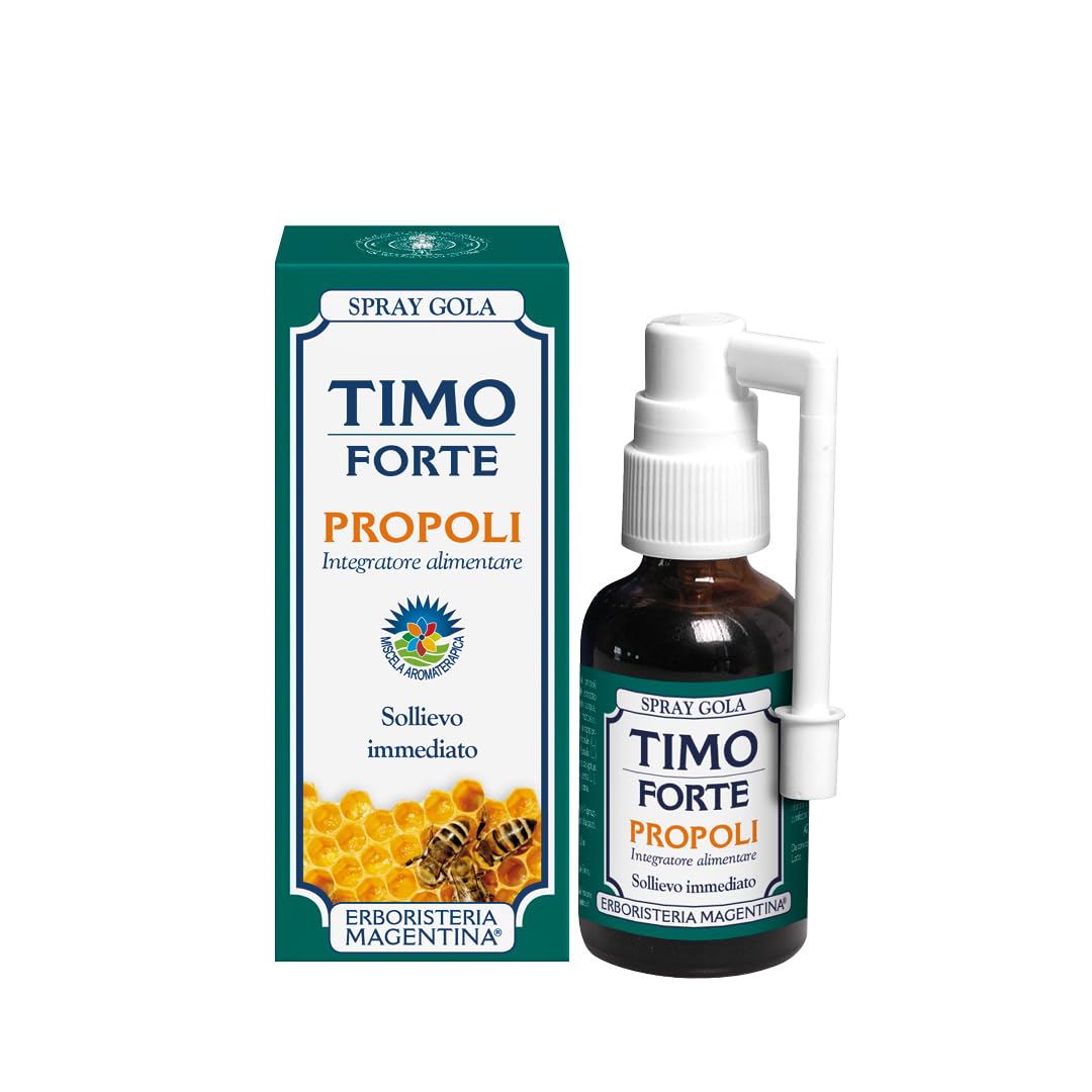 Gola Propoli Spray, with its high quality, is a unique product on the market and essential for all types of throat and oropharyngeal discomfort. Indications: Ideal for discomfort and pain related to the throat and oral cavity. It acts immediately as an emollient and soothing agent for the oropharyngeal mucosa, and thanks to the action of Timo and Propoli, proper respiratory function is restored. Furthermore, the action of Erisime helps resolve problems of hoarseness and aphonia. Active Ingredients: Aqueous extract of type: antibacterial, antibiotic Propolis: reduces inflammation and stops its development Dry extract of Erythritol: relieves inflammation and resolves hoarseness and aerophony Dry extract of Helleborine: soothes the oropharyngeal mucosa Essential oil of Peppermint: refreshes the throat and clears the nose Mirimole: anti-inflammatory and antibacterial. Directions for use: It is recommended to spray 4 times into the throat (0.52 ml) and swallow. Repeat at least 3 times a day, between meals. Notably, due to its balsamic, antiseptic, and refreshing properties, thyme (Timo) is also able to help the respiratory tract defend itself against attack by infectious bacteria because it is rich in phenols, terpinene, tannins, and savonnins. The balsamic action of thyme is enhanced by the presence of propoli, a natural anti-inflammatory. Use: internal. INGREDIENTS: Aqueous extract of thyme, propoli, dry extract of herb (Hrisime), dry extract of 'Hautea', essential oil of peppermint (Mirra).An essential spray for the health and well-being of the throat and oropharyngeal canal.Erboristeria Magentina - Spray Gola TIMO Forte avec éléments 30 ml - Soulagement ImmédiatDESCRIPTION DU PRODUIT DESCRIPTION DU PRODUIT Pour sa haute qualité, le Spray Gola Propoli est un produit inimitable sur le marché et indispensable pour tout type de malaise à la gorge et à l'appareil oropharynge. Indications Idéal en cas de gêne et de malaise liés à la gorge et au câble oral. Il agit immédiatement comme émollient et lénitif de la muqueuse oropharyngée et, grâce à l'action du Timo et de la Propoli, la fonctionnalité correcte des voies respiratoires est restaurée. De plus, l'action de l'Erisime, aide à résoudre les problèmes de chute de voix et afonie. Principes actifs Extrait aqueux de type : antibactérien, antibiotique Propolis : réduit l'inflammation et arrête le développement Extrait sec d'Erythse : soulage les inflammations et résolve la raucision et l'aérophonie Extrait sec de Hauteur: : soulage la muqueuse oropharyngée Huile essentielle de mente: rafraîchit la gorge et libère le nez MIr: anti-inflammatoire et antibactérien. Indications d'utilisation Il est conseillé d'effectuer 4 éclaboussures en gorge (0,52 ml) et avaler Répéter au moins 3 fois par jour, loin des repas. Curiosité de ses propriétés balsamiques, antiseptiques et rafraîchissantes, le Timo est également capable d'aider les voies respiratoires à se défendre contre l'attaque des bactéries infectantes car riche en phénols, terpinène, tannins et savonnines. L'action balsamique du thym est renforcée par la présence de la Propoli, anti-inflammatoire naturel. Utilisation : intérieur INGRÉDIENTS Extrait aqueux de Timo, Propoli, Extrait sec d'Hrisime, Extrait sec d'Hautea, Huile essentielle de Menthe, Mirra.Spray indispensable pour la santé et le bien-être de la gorge et du câble oropharinise.