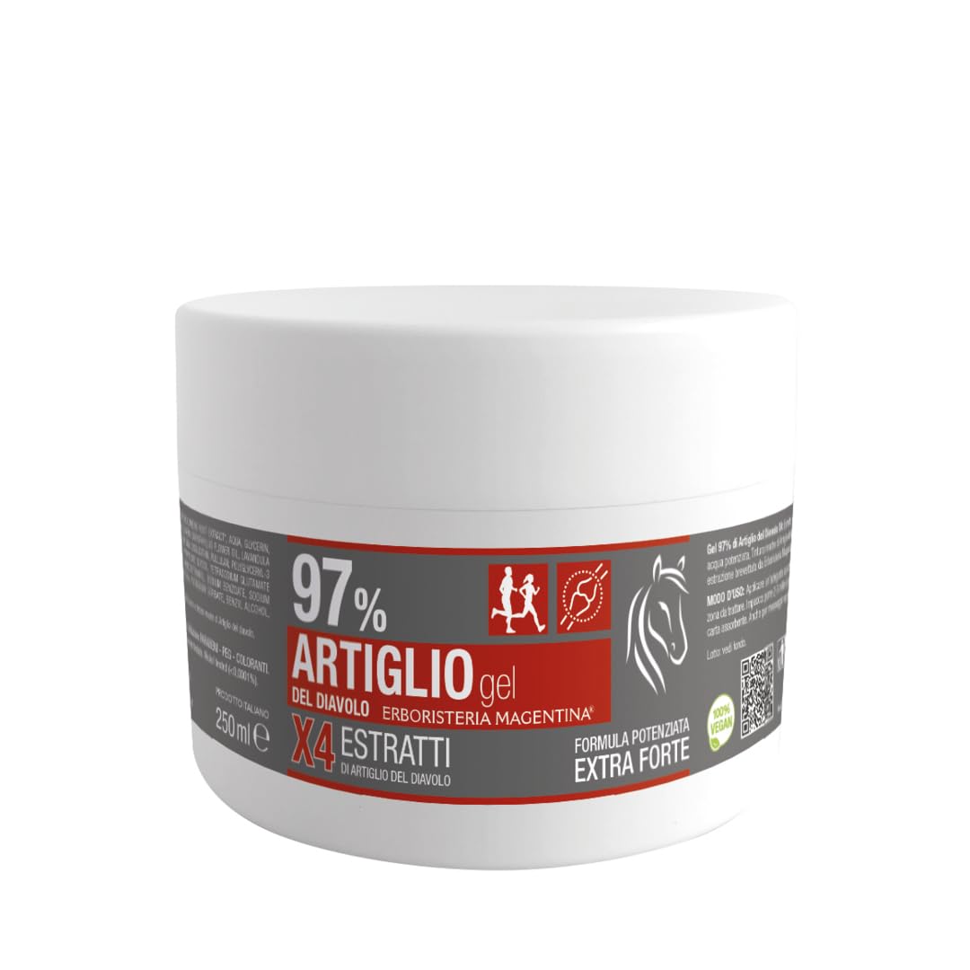 Application: outdoor. Massage - It is suitable for sports and physiotherapy, because massage promotes the penetration of active substances. Application: Apply 2-3 mm of gel and wrap with absorbent paper and then cover with a warm cloth. Instructions for use: Apply the gel to the affected area as often as necessary. Active ingredients: dry devil's claw extract - glyceric devil's claw extract - powerful devil's claw water - coloring of devil's claw mother - anchor essential oil - lavender oil. Application concentrate based on devil's claw extracts, dries quickly and leaves a pleasant fresh feeling. Without thermogenic or kriogenic effect, ideal for the whole family. Gel based on devil's claw with quickly absorbing devil's claw for relief and well-being.Erboristeria Magentina Gel 97 duivelsklauw X4Toepassing: buiten. Massage - Het is geschikt voor sport- en fysiotherapie, omdat massage het binnendringen van werkzame stoffen bevordert. Inwerking: 2-3 mm gel aanbrengen en met een absorberend papier inwikkelen en vervolgens met een warme doek bedekken. Gebruiksaanwijzing: Breng de gel zo vaak als nodig op de aangetaste plaats aan. Werkzame stoffen: droog duivelsklauweextract - glycerisch duivelsklauweextract - krachtig water van duivelsklauw - kleuring van de moeder van de duivelsklauw - etherische olie van ankers - lavendelolie. Toepassingsconcentraat op basis van duivelklauwextracten, droogt snel en laat een aangenaam fris gevoel achter. Zonder thermogene of kriogene werking, ideaal voor het hele gezin. Gel op basis van duivelsklauw met snel absorberende duivelklauw voor ontlasting en welzijn.