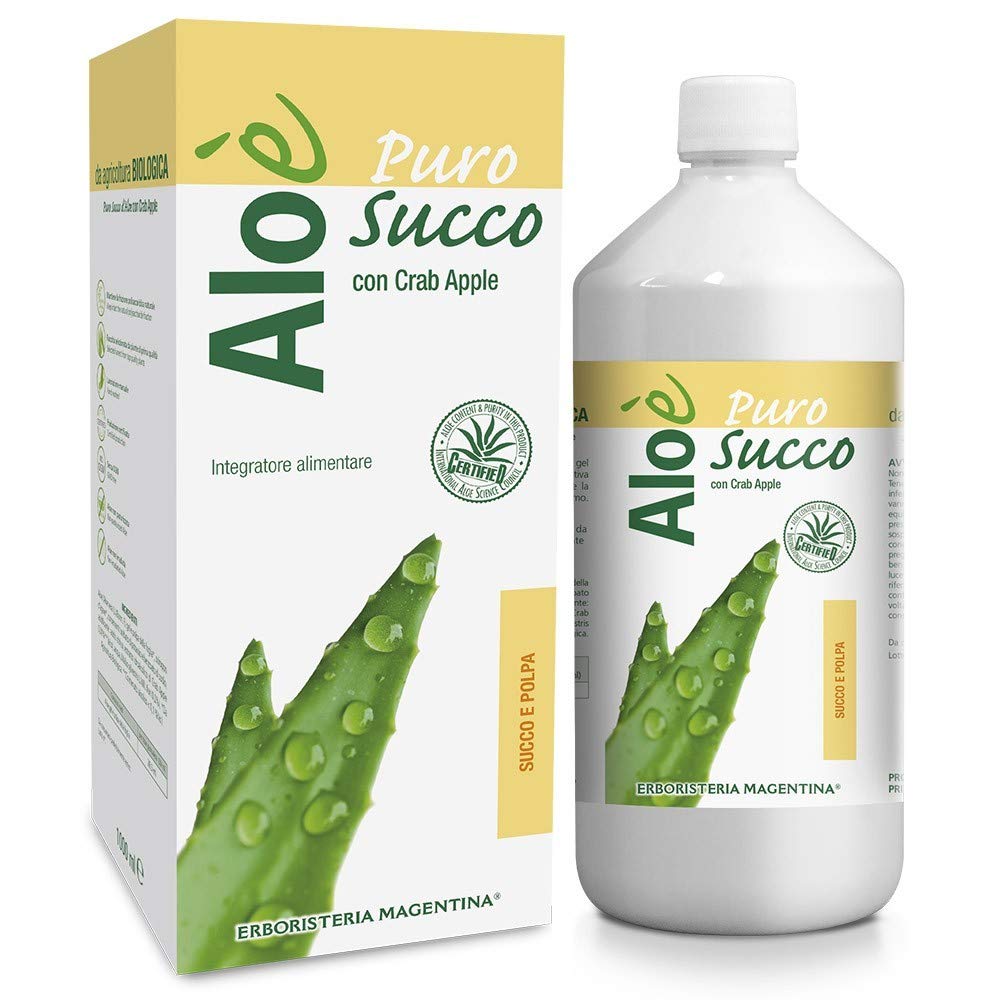 Food supplement made with Aloe Vera juice and pulp. The presence of whole pulp pieces provides a faster soothing and protective action on the gastric mucosa. It is unfiltered and unprocessed, remaining pure and unrefined. Indications It adheres to the walls of the esophagus and stomach, creating a barrier that protects tissues from gastric juices and other irritants, effectively reducing the burning sensation. Agave syrup rounds out the tangy flavor of the aloe without altering it, making it ideal for those unaccustomed to or who dislike strong flavors. Active Ingredients Concentrated Aloe Vera juice and pulp: regenerating, soothing, decongestant, refreshing Agave Syrup: Remineralizing (source of calcium, magnesium, potassium, and iron), naturally sweet, doesn't alter the flavor, and has a low glycemic index Crab Apple: This is the floral remedy for purification, further strengthening the body by helping it eliminate accumulated toxins. Directions for Use It is recommended to take 30 ml of juice in the morning, preferably between meals. Warning Warnings: Store in a cool, dry place, away from light. The expiration date refers to the product when properly stored in its original, unopened container. Once opened, refrigerate and consume within 30 days. Keep out of reach of children under 3 years of age. Do not exceed the recommended daily dose. Supplements should not be considered a substitute for a varied and balanced diet and a healthy lifestyle. Use: Indoors INGREDIENTS Concentrated Aloe Vera juice and pulp, Agave syrup, Crab Apple.Alcool pur jus avec pulpe 1000 mlDESCRIPTION DU PRODUIT DESCRIPTION DU PRODUIT Intégrateur alimentaire à base de jus et de pulpe d'Aloe Vera. La présence des pièces entières de pulpe exerce une action philmante et protectrice plus rapide sur les muqueuses gastriques. Il n'est pas filtré ni traité, mais il est pur intégral. Indications Il adhère sur les parois d'oesophage et d'estomac avec un effet barrière qui protège les tissus des jus gastriques ou autres agents irritants, réduisant efficacement la sensation de brûlure. Le sirop d'Agave arrondi la saveur acidulo de l'aloe sans l'altérer, idéal pour ceux qui n'ont pas l'habitude ou n'aiment pas les goûts aspris. Principes actifs Jus concentré et pulpe d'Aloe Vera : régénérant, apaisant, décongestionnant, rafraîchissant Sirop d'Agave : reminéralisant (source de calcium, Magnesium, potassium et Ferre), doux naturel qui n'altère pas la saveur et possède un faible indice glycémique Crab Apple: c'est le remède floral de l'épuration, pour donner encore plus de force à l'organisme en l'aidant à se libérer des substances toxiques accumulées. Indications d'utilisation Il est conseillé de prendre 30 ml de jus le matin de préférence loin des repas. Avertissement Avertissements : conserver dans un endroit frais et sec, loin de la lumière. La date d'expiration se réfère au produit correctement conservé, dans une boîte intégrale. Une fois le paquet ouvert, conserver au réfrigérateur et consommer dans les 30 jours. Tenir hors de portée des enfants de moins de 3 ans. Ne pas dépasser la dose quotidienne recommandée. Les compléments ne doivent pas être considérés comme des substituts d'un régime varié et équilibré et d'un mode de vie sain. Utilisation : intérieur INGRÉDIENTS Jus concentré et pulpe d'Aloe Vera, sirop d'Agave, Crab Apple.