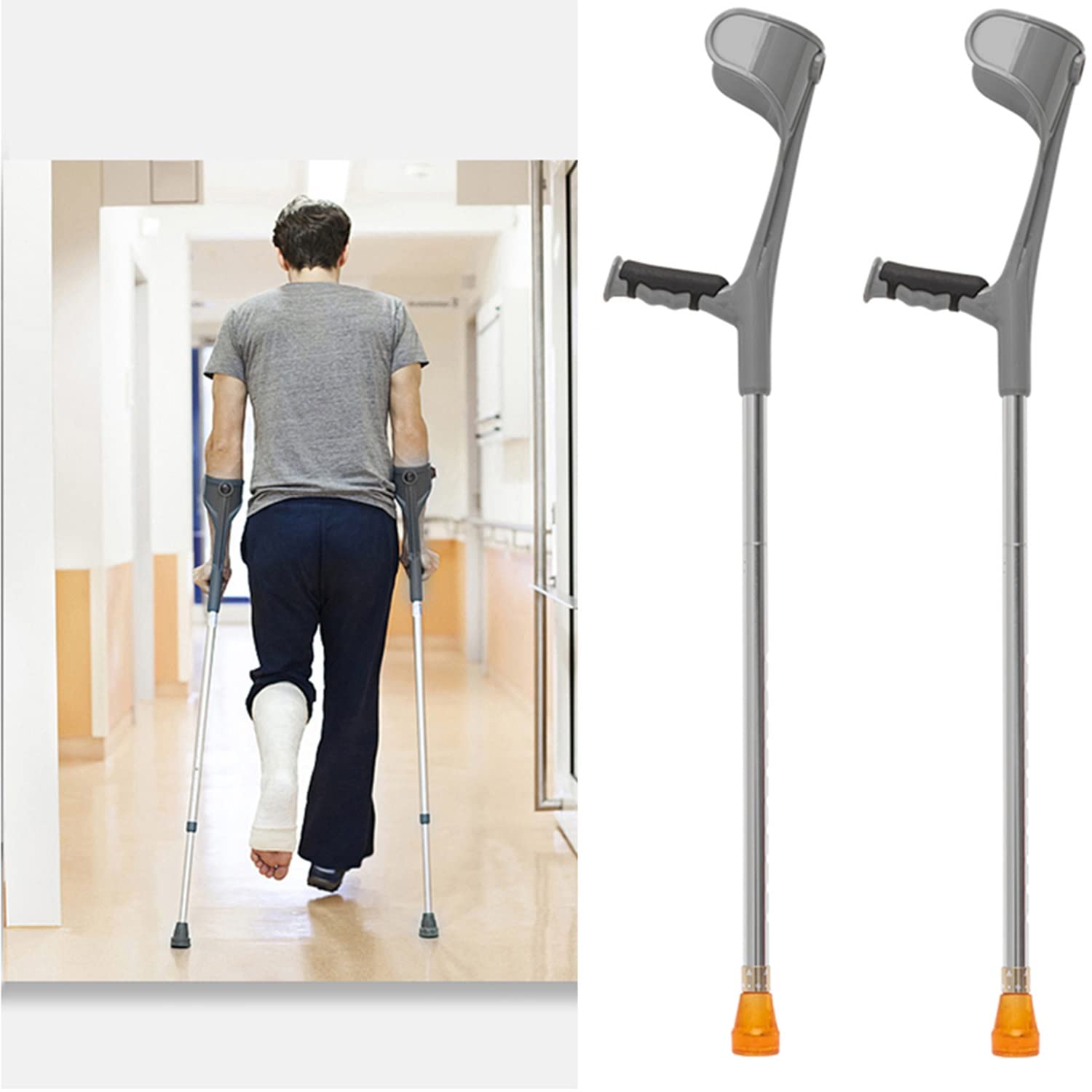 Packing list: forearm crutches 2 Forearm crutches are suitable for people with disabilities, patients, middle-aged people, restricted movement of one leg, unable to bear the same weight, neurological diseases or accidental fractures, and hope to bring comfort and hope to your life. Specification: ? Product name: forearm crutches ? Color: black, silver ? Material: Aluminum alloy. ? Thickness: 1.2mm ? Size: 91-114cm adjustable ? Gear position: 10 gear adjustment Notice: 1. The color may vary due to different screen resolutions, please refer to the actual product. 2. Due to different measurement methods, there may be a size error of 1-3 cm, please understand5. Chic and fashionable floral patterns that anyone can use. It can be used as gifts for Mother's Day, Respect for the Aged Day, birthday, and discharge from hospital. 3. Adjustable forearm crutches, 10 levels of adjustable height, adjustable range 91-114cm, easy to adjust the height of the . 1. U-shaped ergonomic design, wrapping the forearm, easy to apply force, soft rubber handle design, effectively alleviating the hand pain caused by long-term use. 4. Aluminum alloy tube body, the rod body is made of high-quality aluminum alloy, the tube wall becomes thicker, and the lateral pressure test can withstand a load of up to 150kg. 2. The non-slip rubber base is made of sturdy non-slip rubber, which can increase traction and stability. The beef tendon foot cover is displayed, and it contains metal gaskets, which is wear-resistant and non-slip.