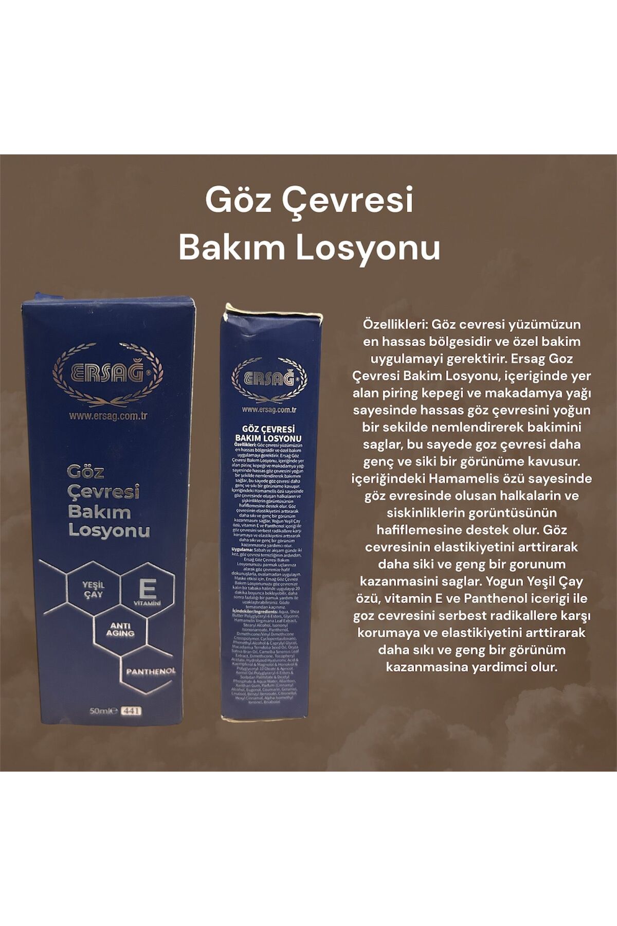 • Özellikleri : Göz çevresi yüzümüzün en hassas bölgesidir ve özel bakim uygulamayi gerektirir. Ersag Göz Çevresi Bakim Losyonu, içeriginde yer alan pirinç kepegi ve makadamya yagi sayesinde hassas göz çevresini yogun bir sekilde nemlendirerek bakimini saglar, bu sayede göz çevresi daha genç ve siki bir görünüme kavusur. Içerigindeki Hamamelis özü sayesinde göz çevresinde olusan halkalarin ve siskinliklerin görüntüsünün hafiflemesine destek olur. Göz çevresinin elastikiyetini arttirarak daha siki ve genç bir görünüm kazanmasini saglar. Yogun Yesil Çay özü, vitamin E ve Panthenol içerigi ile göz çevresini serbest radikallere karsi korumaya ve elastikiyetini arttirarak daha siki ve genç bir görünüm kazanmasina yardimci olur.
