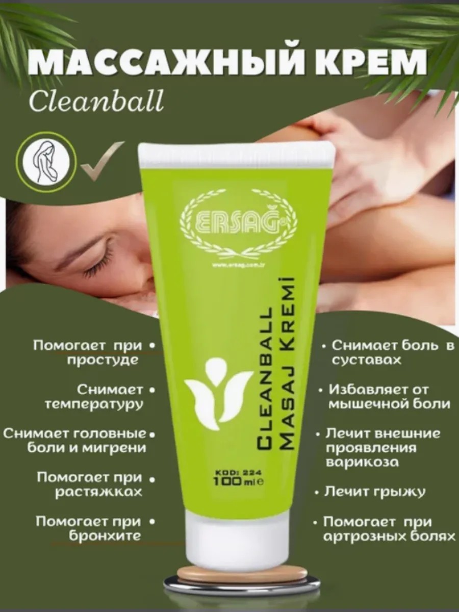 Массажный крем ( обезболивающий крем для суставов ) - Этот крем должен быть в каждом доме. Создан на основе ментола и других целебных трав, которые помогают расслаблению и снятию боли. Снимает головную боль (даже мигрень). Боли в области всего позвоночника, боль в суставах. Снимает тяжесть и боль в ногах при варикозе. Первый помощник при простудах. Насморк, кашель (втираем и дышим испарениями применяем при ингаляции, нанесение наружно вокруг носа защищает от вирусов). При укусах насекомых, при болях в области живота и яичников (при менструации). Для разогрева мышц перед занятиями спортом, а также для снятия боли после тренировок. Применение: Нанести на больной участок тела, легкими массирующими движениями. Крем легко впитывается, не оставляет жирных следов . Особенности: крем для массажа СLEANBALL производиться из экстрактов растений для косметических целей. Не является лекарством. Массажный крем ERSAG. Clean Ball – крем для массажа производства Турция, который должен быть в каждом доме. Продукт с ментолом и экстрактом ромашки способствует расслаблению и снятию различных видов боли: головной боли (в том числе при мигрени), менструальной, боли в суставах и мышцах, в области позвоночника. Средство прекрасно снимает тяжесть и боль в ногах при варикозе (можно беременным). Первый помощник при простудах. Насморк, кашель (втираем и дышим испарениями). При укусах насекомых, от комаров, при болях в области живота (при менструации). Для разогрева мышц перед занятиями спортом, а также для снятия боли после тренировок. Массажный крем является первоклассным средством для профессионального массажа тела. Сочетание высококачественных натуральных ингредиентов делает его идеальным для расслабления различных мышечных групп и снятия напряжения, противовоспалительный эффект. Бальзам ERSAG помогает ускорить кровоток в мышцах и повысить их эластичность, что идеально подходит для длительных тренировок или физических нагрузок. Зеленый крем обезболивающий