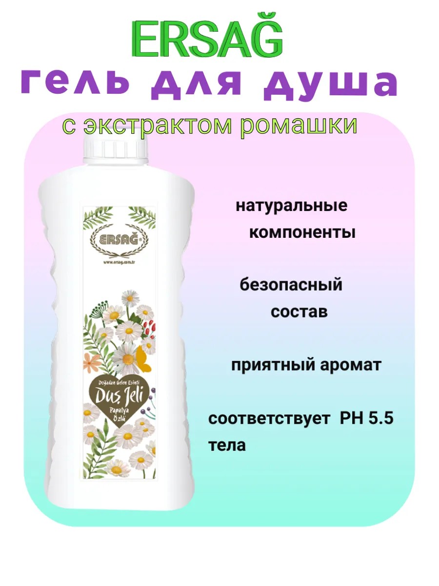 Гель соответствует уровню PH кожи 5.5. Постоянное применение геля для душа с ромашкой Эрсаг подарит бодрость и свежесть. А так же позволит избежать сухости кожи, шелушения с чувства стянутости на поверхности.Положительно влияет на предотвращение отеков на коже., уменьшает морщины. Подарит прекрасное настроение как в вечером и после сеансы СПА после занятий или рабочего дня, так и после утреннего подъема. Веганский продукт, без парабенов, красителей, сульфатов и других вредных добавок.