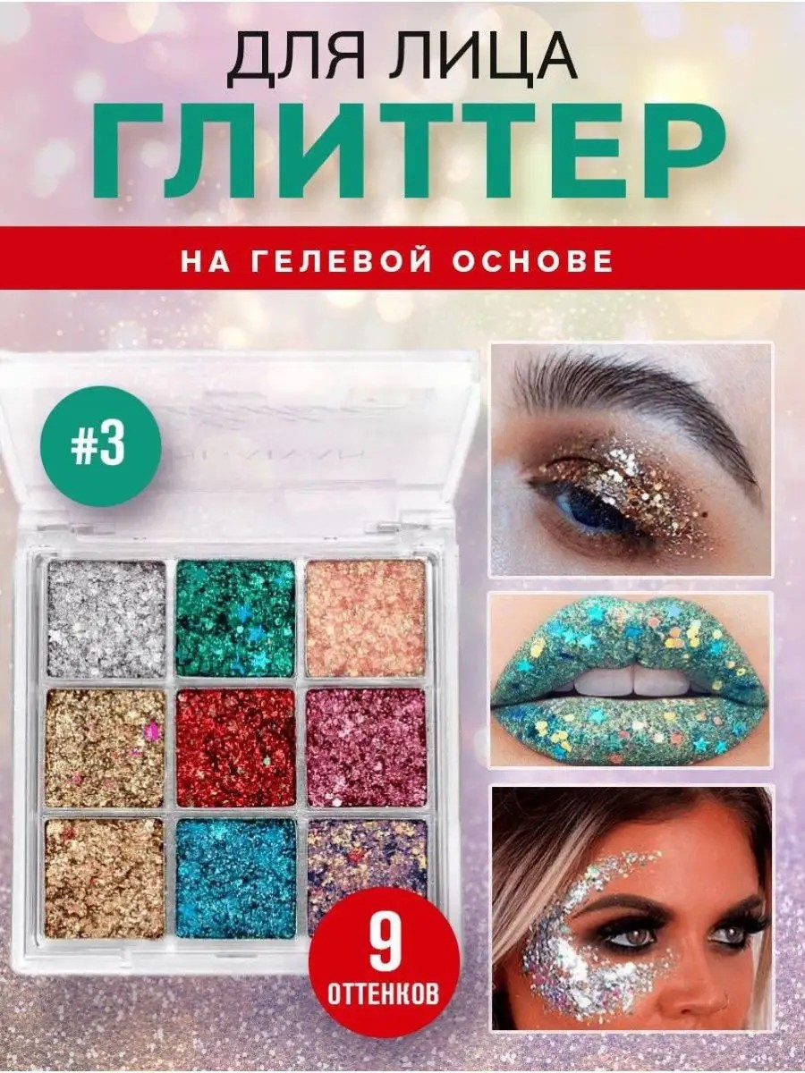 Данная палетка глиттерных теней 9 цветов подойдет , если вы хотите разнообразить макияж глаз сиянием, глиттер придется как нельзя кстати. Он может быть уместным не только в вечернем и праздничном, но и повседневном мейк-апе, все зависит от способа нанесения и других нюансов. Глиттер - уникальный сияющий элемент, который в последнее время стал актуальным трендом в бьюти-индустрии. Ранее блестки в макияже ассоциировались с подиумным образом, сейчас же глиттер может стать частью даже повседневного мейка. Также такое средство подойдет для фотосессии или видеосъемки. Жидкие тени для лица, тела. Шиммерные тени для подростков. Палетка теней для девочек. Глиттер, тени для концерта, глиттер для концерта, тени для вечеринки, тени для встречи, тени на свидание, косметика для выступлений, Подарите нашу косметику родным и близким на 14 февраля в день влюбленных, на 23 февраля, на 8 марта и каждый день)