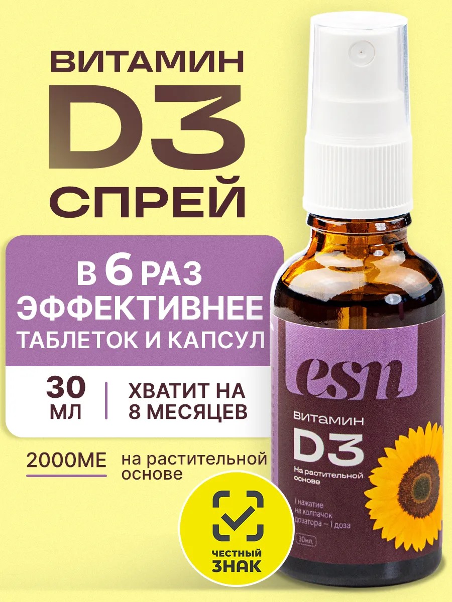 Витамин D3 2000me от ESN содержит 2000 МЕ в одном распылении, что соответствует рекомендованной дневной норме для взрослых. Преимуществом витамина Д является удобная форма выпуска – спрей и органический состав без ГМО. Бад Д 2000 МЕ рекомендован к приему для лечения и профилактики дефицита витамина Д3. Бады с витаминов Д в жидкой форме в виде спрея распыляется прямо в рот, что позволяет веществам быстрее и полнее усваиваться. D 3 в спрее очень удобен для приема детям, которые часто испытывают трудности с глотанием обычных таблеток или капсул. Биологически активная добавка с Д3 необходим каждому для нормального функционирования организма. Дефицит витамина Д3 является распространенной проблемой, особенно при дефиците солнца и зимой. Низкий уровень витамина D в организме связан с риском развития сердечно-сосудистых и неврологических заболеваний, бессонницы, ухудшения памяти и других симптомов. Регулярный прием профилактической дозы способствует: сохранению здорового состояния костей; нормализации уровня кальция в крови и улучшению усвоения фосфора; восстановлению функционирования мышц; сохранению состояния зубов, ногтей, волос и кожи; нормализации работы иммунной системы. Также витамин Д влияет на нервную систему, улучшая память и внимание.