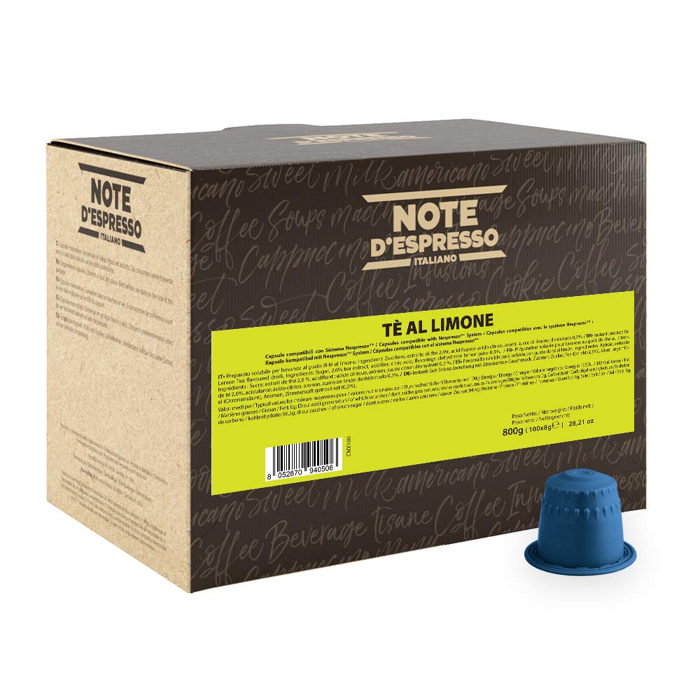 Instant Lemon Tea Capsules Compatible with Nespresso Machines, 100 x 8g. INGREDIENTS Sugar, Tea Extract (2.6 ), Acidifier: Citric Acid, Flavorings, Dehydrated Lemon Juice (0.3 ) INSTRUCTIONS FOR USE Insert the capsule, close the lid and select the desired cup size. SAFETY WARNING Keep it dry. Visit BRAND STORE to discover the entire NOTE D'ESPRESSO selection direct link under the product title. Recommended water dose 100 ml. Practical pack of 100 new generation capsules fully certified for oxygen barrier (even out of the bags, they do not lose their aroma, ideal for those with drawers or capsule holders). Made in Italy. Enjoy the delicious taste and aroma of a quality lemon tea in an ultra-practical 8 gram capsule format. Exclusively compatible with NESPRESSO (Not registered with EU S.a.r.l.) capsule machines. Capsules de thé instantané au citron compatibles avec les machines Nespresso, 100 x 8 g. INGRÉDIENTS Sucre, extrait de thé (2,6 ), acidifiant : acide citrique, arômes, jus de citron déshydraté (0,3 ) MODE D'EMPLOI Insérez la capsule, fermez le couvercle et sélectionnez la taille de tasse souhaitée. AVERTISSEMENT DE SÛRETÉ Gardez-le au sec. Visitez BRAND STORE pour découvrir toute la sélection NOTE D'ESPRESSO lien direct sous le titre du produit. Dose d'eau recommandée 100 ml. Paquet pratique de 100 capsules de nouvelle génération entièrement certifiées pour la barrière à l'oxygène (même hors des sacs, elles ne perdent pas leur arôme, idéal pour ceux qui ont des tiroirs ou des porte-capsules). Fabriquée en Italie. Profitez du goût et des arômes délicieux d'un thé au citron de qualité dans un format capsule de 8 grammes ultra-pratique. Exclusivement Compatibles avec les machines NESPRESSO (Non enregistré auprès d' EU S.a.r.l.) à capsules.