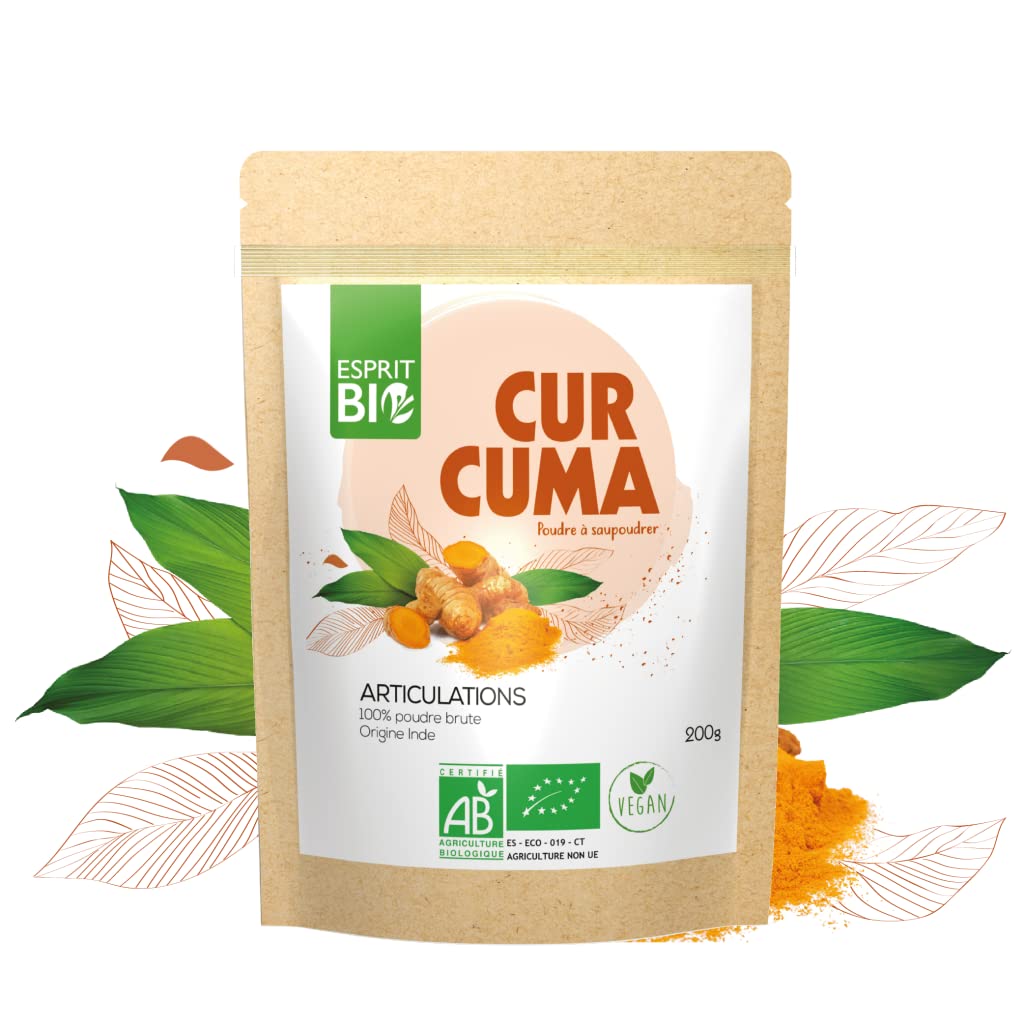 Esprit bio is your partner for daily organic healthy eating, with quality, flavors and responsible commitment! Organic turmeric is a key ingredient for diversifying your diet in a healthy and tasteful way. This superfood contributes to joint comfort and digestive comfort. You can sprinkle turmeric on your dishes or mix it with sauces, smoothies or other drinks. Our organic turmeric is produced in India, in the heart of turmeric plantations chosen by us for the quality of their production and their compliance with European organic certification rules. The roots of the plant have the particularity of growing into rhizomes, like underground fruits, and it is these rhizomes which give the powder that we all know. They are simply collected, dried and ground into powder, without any processing. For our superfoods, we have favored an airtight kraft paper and food plastic bag which allows us to guarantee all the natural quality of the organic ingredient on your plate. Store in a dry, cool place, away from heat and humidity. Cannot replace a varied, balanced diet and a healthy lifestyle. It is recommended to respect the recommended daily dose. Keep out of reach of young children. Read the precautions carefully before using. Manufacturers may occasionally change the composition of their products and or their labeling. Actual product labeling may contain more and or different information than that shown on our site. Always read the information, warnings and conditions of use on the label or packaging before using or consuming a product. Any opinions and comments relating to the products are the sole responsibility of their authors, they are in no way endorsed or approved by the Manufacturer. .ALL OPINIONS AND COMMENTS RELATING TO PRODUCTS ARE THE SOLE RESPONSIBILITY OF THEIR AUTHORS, THEY ARE IN NO WAY ENDORSED OR ENDORSED BY THE MANUFACTURER INGREDIENTS 100 Turmeric powder Ingredient of agricultural origin obtained according to organic production rules. DIRECTIONS FOR USE to mix or sprinkle ORGANIC QUALITY – Esprit bio guarantees the impeccable quality of its products, according to European organic certification rules, and tests each batch for pesticides and glyphosate. ? USE – Turmeric can be mixed into sauces, drinks or sprinkled on dishes. ? HEALTH – Turmeric contributes to joint comfort. Turmeric contributes to digestive comfort. TURMERIC – This bright orange powder known as a spice is obtained from the flesh of the plant's roots. You want to be able to eat by diversifying your menus and taking care of your health: turmeric is for you! Esprit bio, c'est votre partenaire pour une alimentation santé bio au quotidien, avec qualité, saveurs et engagement responsable ! Le curcuma bio est un ingrédient clé pour diversifier son alimentation de façon saine et avec goût. Ce superaliment contribue au confort des articulations et au confort digestif. Vous pouvez saupoudrer le curcuma sur vos plats ou le mélanger à des sauces, smoothies ou autre boisson. C'est en Inde, au cœur de plantations de curcuma choisies par nos soins pour la qualité de leur production et leur adéquation avec les règles de certification bio européennes qu'est produit notre curcuma bio. Les racines de la plante ont la particularité de grossir en rhizomes, comme des fruits souterrains, et ce sont ces rhizomes qui donnent la poudre que nous connaissons tous. Ils sont simplement ramassés, séchés et réduits en poudre, sans aucune transformation. Pour nos superaliments, nous avons privilégié un sachet en papier kraft et plastique alimentaire hermétique qui nous permet de garantir jusqu'à votre assiette toute la qualité naturelle de l'ingrédient bio. Conserver dans un endroit sec et frais, à l'abri de la chaleur et de l'humidité. Ne peut remplacer une alimentation variée, équilibrée, et un mode de vie sain. Il est recommandé de respecter la dose journalière conseillée. Tenir hors de portée des jeunes enfants. Bien lire les précautions d'emploi avant tout usage. Les fabricants peuvent occasionnellement modifier la composition de leurs produits et ou leurs étiquetages. L'étiquetage réel des produits peut contenir des informations supplémentaires et ou différentes de celles figurant sur notre site. Veillez à toujours prendre connaissance des informations, avertissements et conditions d'utilisation figurant sur l'étiquette ou l'emballage avant d'utiliser un produit ou de le consommer.Tout avis et commentaires relatifs aux produits sont de la responsabilité unique de leurs auteurs, ils ne sont en aucun cas cautionnés ou approuvés par le Fabricant. .TOUT AVIS ET COMMENTAIRES RELATIFS AUX PRODUITS SONT DE LA RESPONSABILITÉ UNIQUE DE LEURS AUTEURS, ILS NE SONT EN AUCUN CAS CAUTIONNÉS OU APPROUVÉS PAR LE FABRICANT INGRÉDIENTS 100 poudre de Curcuma Ingrédient d'origine agricole obtenu selon les règles de production biologique. MODE D'EMPLOI à mélanger ou saupoudrer QUALITE BIO – Esprit bio garantit une qualité irréprochable de ses produits, selon les règles de certification bio européennes, et teste chaque lot en pesticides et glyphosate. ? UTILISATION – Le curcuma peut être mélangé dans des sauces, boissons ou saupoudré sur des plats. ? SANTE – Le curcuma contribue au confort des articulations. Le curcuma contribue au confort digestif. CURCUMA – Cette poudre orange vif connue comme épice est obtenue à partir de la chair des racines de la plantes. Vous voulez pouvoir vous alimenter en diversifiant vos menus et en prenant soin de votre santé : le curcuma est fait pour vous !.