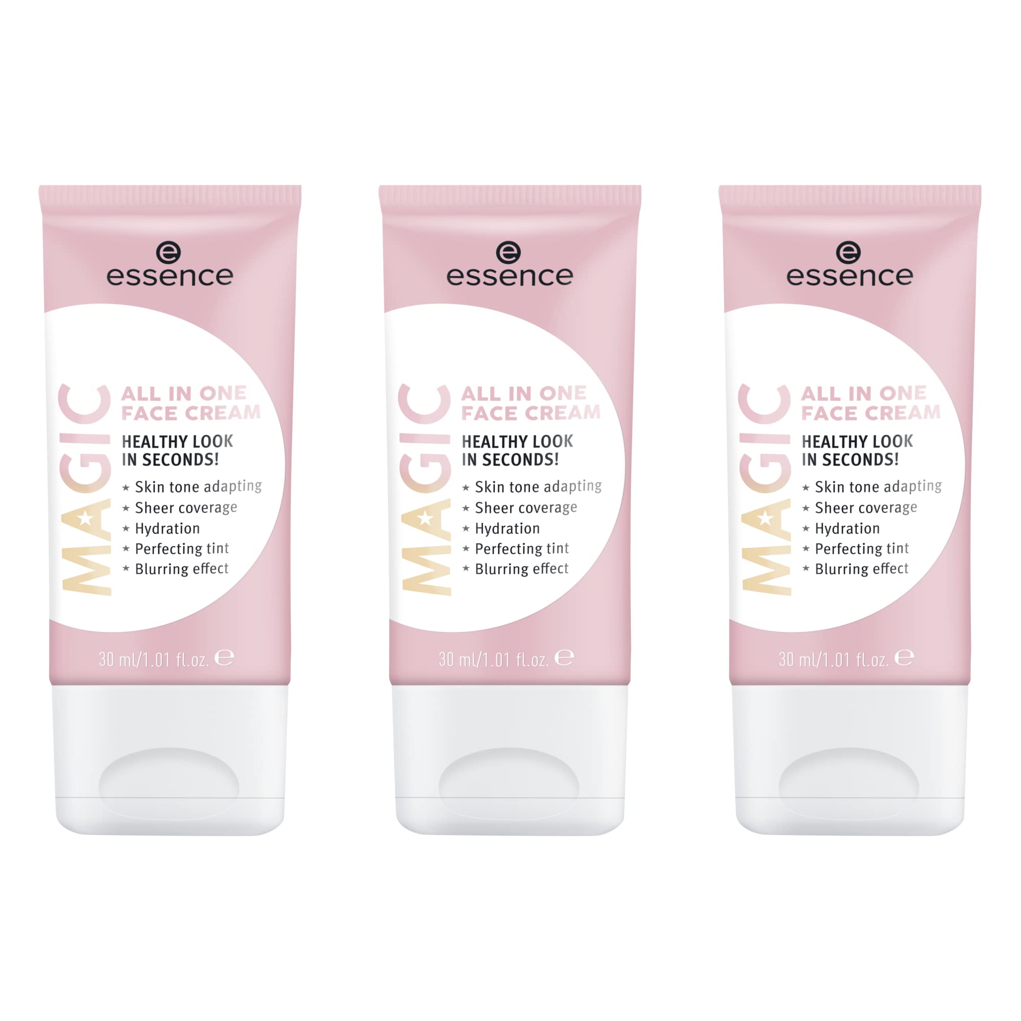 In a convenient MULTI pack. Magic All in One Skin Cream is a game changer in your beauty routine. The cream contains color capsules that are released upon application and then blend seamlessly with your natural skin tone. Thanks to its sheer coverage, there's no mask-like effect, and with its moisturizing properties, the cream provides an even, healthy-looking complexion with a blurry finish – in seconds. This day cream also has SPF 10. We say no to animal testing. Cosnova is listed with essence and CATRICE by both PETA Germany and PETA International. INGREDIENTS Ingredients: Aqua (Water), Macadamia Seed Oil, Ethylhexyl Salicylate, Glycerin, Butylene Glycol, Sucrose Stearate, Silica, Bis-Ethylhexyloxyphenol, Triazyl Methoxyphenol, TOCOPHATE. EROL, SODIUM HYALURONATE, HYDROXYACETOPHENONE, MICROCRYSTALLINE CELLULOSE, SUCROSE LAURATE, HYDROGENATED STARCH HYDROLYSATE, CELLULOSE GUM, ETHYLHEXYLGLYCERIN, TRIETHOXYCAPRYLYLSILANE, SUCROSE DILSILANE AURATE, SUCROSE TRILAURATE, PHENOXYETHANOL, PARFUM (FRAGRANCE), CI 77491 (Iron Oxides), CI 77492 (Iron Oxides), CI 77499 (Iron Oxides), CI 77891 (Titanium Dioxide). DIRECTIONS All-in-one face cream. Adapts to all skin tones. SPF 10. Moisturizing. Creates a subtly tinted, even complexion. See moreBrightening, nourishing, even color, UVA UVB filter, instant results, primer, softening, smoothing, radiant, fresh, translucent, for dry and normal skin. We say no to animal testing. Cosnova is listed with essence and CATRICE by both PETA Germany and PETA International. Vegan, alcohol-free, paraben-free, microplastic-free, nanoparticle-free, gluten-free, and acetone-free. For an even and healthy complexion. With color capsules that are released upon application and adapt to the skin tone. The moisturizing treatment compensates for skin irregularities and has SPF 10.essence Magic Lot de 3 crèmes visage All In One - Crème de jour - Filtre UVA UVB - Lissante et éclatante - Pour peaux sèches - Végétalien - Sans alcool - Sans parabène - Sans particules de 30 ml (3er Pack)DESCRIPTION DU PRODUIT DESCRIPTION DU PRODUIT Dans un pack pratique MULTI. La crème Magic All in One Skin est le changement de jeu dans la routine de beauté. La crème contient des capsules de couleur qui sont libérées lors de l'application puis se fondent avec le teint naturel de la peau. Grâce à sa légère opacité, il n'y a pas d'effet masque et, avec ses propriétés hydratantes, la crème donne un teint uniforme et sain avec une finition blurry – en quelques secondes. En outre, le soin de jour a un SPF 10. Nous disons non à l'expérimentation animale. Cosnova est répertorié avec essence et CATRICE à la fois chez PETA Allemagne et PETA internationalement. INGRÉDIENTS Ingrédients : aqua (eau), huile de graines de macadamia, éthylhexyle salocylate, glycérine, glycol butylène, stéarate de sucrose, silica, bis-éthylhexyloxyphénol, méthoxyphénol triazyl. INE, TOCOPH. EROL, SODIUM HYALURONATE, HYDROXYACETOPHENONE, MICROCRYSTALLINE CELLULOSE, SUCROSE LAURATE, HYDROGENATED STARCH HYDROLYSATE, CELLULOSE GUM, ETHYLHEXYLGLYCERIN, TRIETHOXYCAPRYLYLSILANE, SUCROSE DILSILANE. AURATE, SUSU. CROSE TRILAURATE, PHENOXYÉTHANOL, PARFUM (FRAGRANCE), CI 77491 (oxydes de fer), CI 77492 (oxydes de fer), CI 77499 (oxydes de fer), CI 77891 (dioxyde de titane). MODE D'EMPLOI Crème pour le visage tout-en-un. S'adapte à tous les tons de peau. SPF 10. Hydratant. Crée un teint subtilement teinté et uniforme. Voir plusÉclaircissant, nourrissant, couleur unie, filtre UVA UVB, résultat instantané, apprêt, adoucissant, lissant, éclatant, frais, translucide, pour peaux sèches, peaux normales. Nous disons non à l'expérimentation animale. Cosnova est répertorié avec essence et CATRICE à la fois chez PETA Allemagne et PETA internationalement. Végétalien, sans alcool, sans paraben, sans microparticules plastiques, sans nanoparticules, sans gluten, sans acétone. Pour un teint uniforme et sain. Avec des capsules de couleur qui sont libérées lors de l'application et s'adaptent au teint de la peau. Le soin hydratant compense les irrégularités de la peau et a un SPF 10.