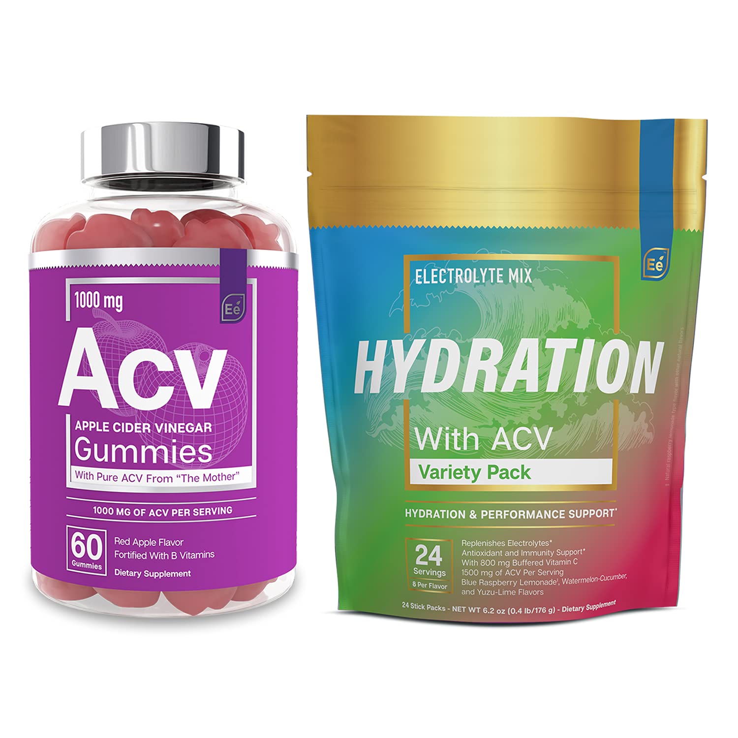 Essential elements Apple Cider Vinegar Gummies are derived from "The Mother" of apple cider vinegar. These gummies are also fortified with essential B vitamins, which can help improve energy levels, cognitive function, cardiovascular health, and more. Combine them with the ACV-powered electrolytes of our Hydration mix and you've got a potent bundle of nutrients to keep you ready for whatever the day may bring.