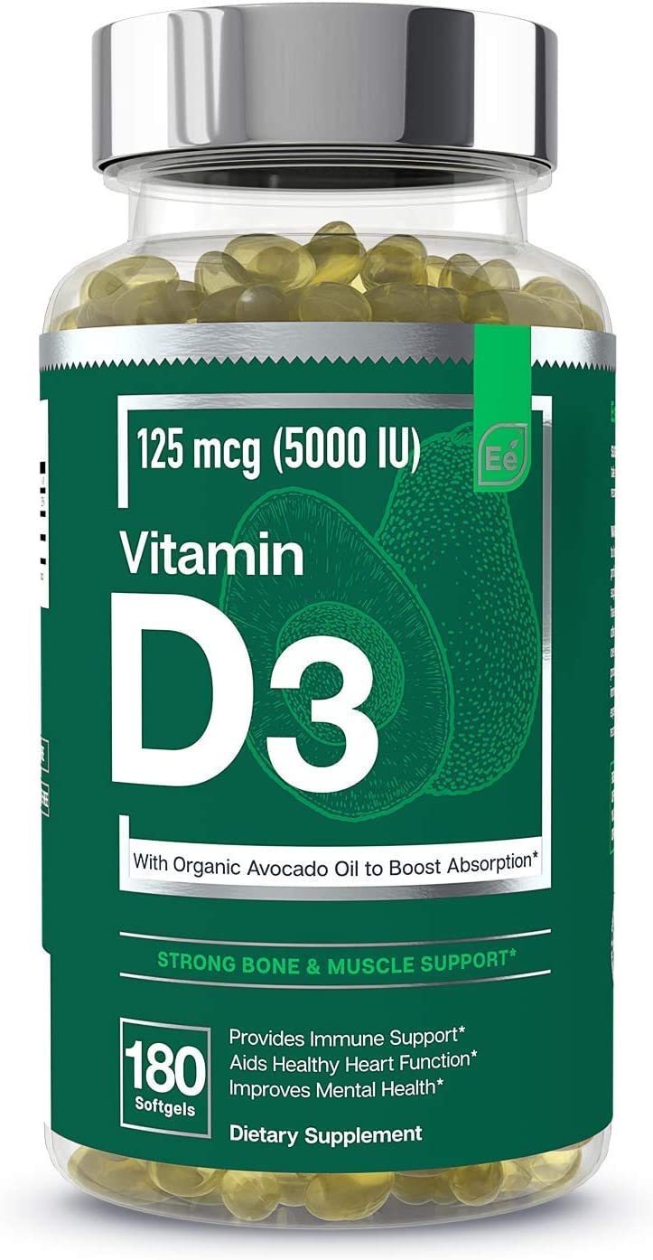 Essential Elements Vitamin D3 5000 IU Softgels with Organic Avocado Oil to Boost Absorption Bone Muscle & Immune Support 180 Count (Pack of 1)