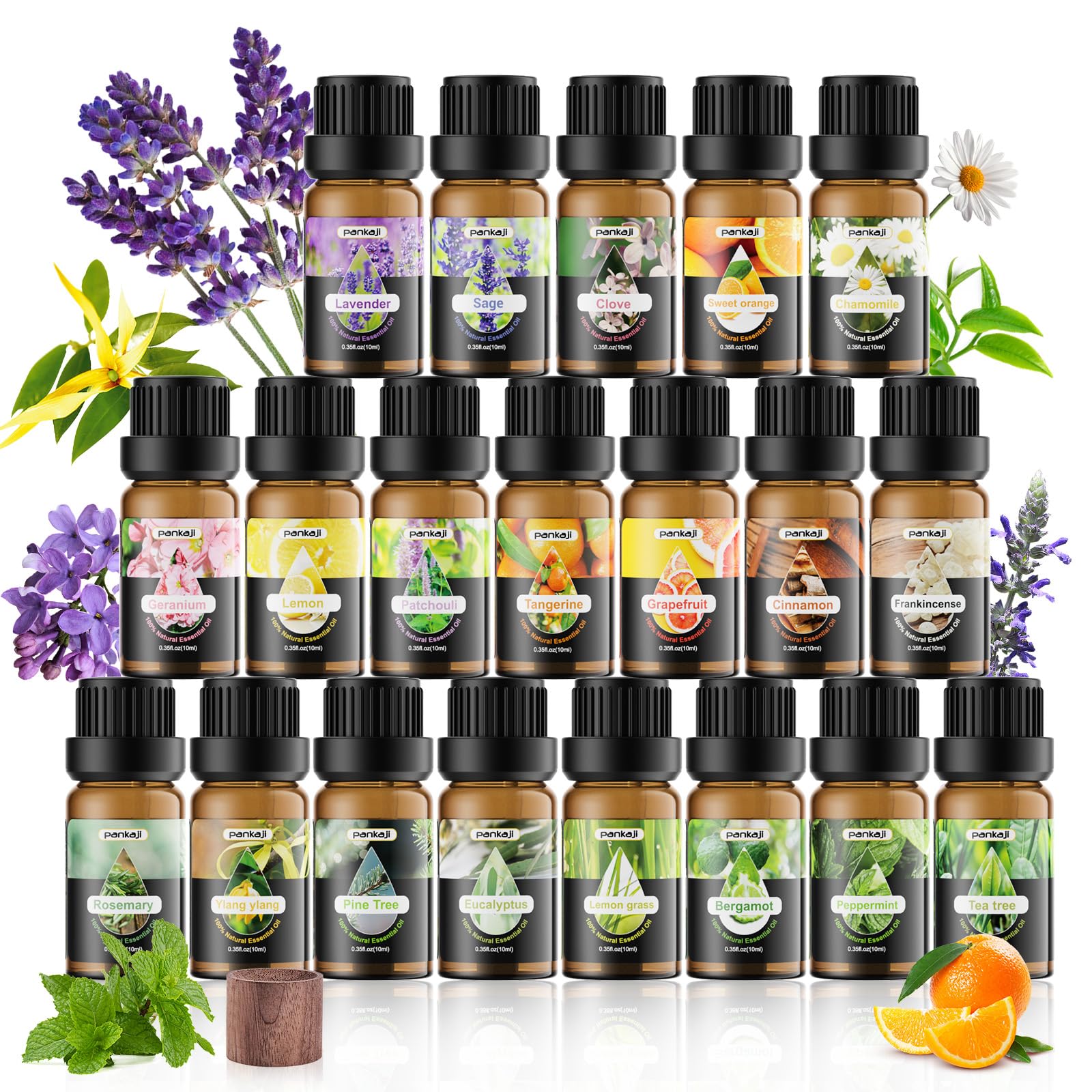 ?Perfect Aromatherapy & Holiday Gifts?- Natural cosmetics for an aromatherapy massage, humidifier, candle making or for the bathtub, the possibilities are endless! Oil diffuser essential oils make a thoughtful gift for someone special in your life! The beautiful packaging of the aromatherapy oil makes it the perfect gift for Christmas, Birthday, Anniversary, Holiday, Teacher's Day, Father's Day, Mother's Day.This is the best gift idea for any essential oil lovers, for all holidays!. ?Comes with a Diffuser Wood?- Put 3-6 drops of diffuser oils fragrance into the groove of the diffuse wood. A light natural scent slowly gives off . Feel the most natural plant aroma with every breath. Diffusion wood can be used in closets, bedrooms, dens, offices, cars and other spaces. Each scent and method will unlock your senses in its own special way! They are versatile and effective, Keeping our moods happy at all times!. ?Multiple Benefits & Life's Essentials?- Meet your ideal essential oil daily basic matching. This 20pcs essential oils set was widely solicited from 500K + essential oil lovers to suggest their needs.Each aromatherapy oil has its own benefits including relaxes the mind, purifies the air of unpleasant odors,improve sleep, home care,etc.you can choose any diffuser oils for your need,good for men,women,office worker and student. ?100% Natural Essential Oils? - A Handpicked selection from different parts of the world!Enjoy a pure natural product from pankaji(No fillers, additives, Bases or Carriers added) - 25% Higher concentration than other aroma diffuser oil, Same amount of essential oils for more stronger fragrance and longer lasting. Our pure essential oils are mainly extracted from various plants?55% - 65%] + pure natural almond oil [30% - 40%] Composition. ?Classic TOP 20 PCS Essential Oils Set?- Making it the perfect essential oil set for beginners or enthusiasts.pankaji essential oils set contains 20 bottles with 10 ml of the most popular oils, Lavender oil, Peppermint oil, Eucalyptus oil, Tea Tree oil, Ylang-ylang oil, Lemon grass oil, Sweet orange oil ,etc! We have kinds of essential oils for you to meet your different needs and also you can DIY to blend them to create new scents. (Please note:these essential oils are for EXTERNAL USE only.).