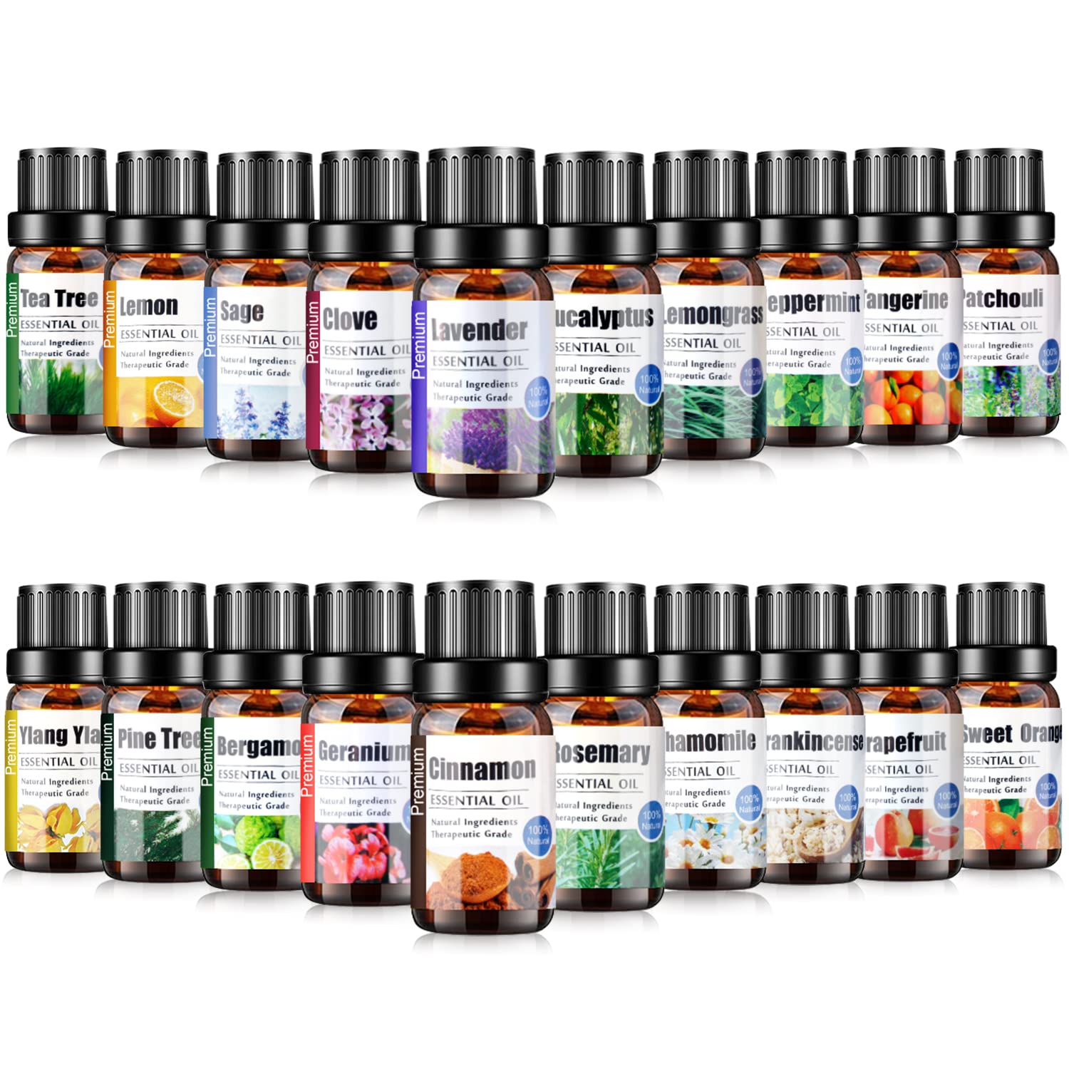 Essential Oils Set-Top Essential Oil Kit for Diffuser, Home Care, Candle Making, Humidifier, Massage, Gifts - Frankincense, Cinnamon, Eucalyptus, Lavender, Tea Tree, Peppermint, Lemongrass - 20 * 10ML Top 20 * 10ML Essential Oil Set: TFKOL essential oils set has 20 different scents. Including: Eucalyptus, Lavender, Tea Tree, Peppermint, Lemongrass, Frankincense, Cinnamon, Bergamot, Patchouli, Pine Tree, Sweet Orange, Lemon, Rosemary, Ylang-Ylang, Grapefruit, Geranium, Clove, Sage, Chamomile,Tanger ine. Note: 1. Mix with carrier oils firstly when use for your skin, please don't use this essential oils directly on your skin 2. Sweet Orange Oil and Bergamot are recommended for night use as they are photosensitive. 3. Please avoid direct sunlight within 4 – 8 hours of application. 4. Pregnant women are advised to use it under professional guidance. Please keep out of the reach of children. 5. If you have any questions, please feel free to contact us and we will sincerely solve all your problems!????Gift Set for Family & Friends?: The perfect gift - Essential oils for diffusers for home. There are 20 different scents, there is always one scent she will like. Perfect for a starter to use essential oil, to experience the beauty of different essential oils and find the one that belongs to you. Great for Birthday, Anniversary, Holiday, Mother's Day, Father's Day, Valentine's Day, Fall, Thanksgiving, Christmas and more. ????Naturally Cruelty-Free & Safety Certification?: Premium grade essential oils have no preservatives, additives, fillers, are vegan friendly, cruelty free and do not require animal testing. All natural oils are GC/MS testing to ensure the highest quality and are 100% guaranteed to be safe and effective for humans. You and your family, friends can use them with complete confidence. Experience the fun of DIY and SPA!. ????100% Pure Essential Oils Gift Set ?: In order to give you the best use of essential oils, we have made formula upgrades. All natural essential oils are extracted from natural plants by steam distillation, extrusion, cold immersion or solvent extraction, and have a high concentration of aroma, a more natural scent and a longer duration. Essential oils are stored in amber bottles to prevent rapid evaporation. ????Multi-Purpose Essential Oil Set?: Essential oils are ideal for use in diffuser or humidifier. Diffusion oils used for massage, air freshening, natural perfumery, bath, saunas, househld items, office, campground, yoga room, car and spa. Best essential oil to making candles, soaps, bath bombs, cream, lotion, shower gel, shampoo, beard oil, etc. ????Top 20*10ml Essential Oil Sets?: essential oils set has 20 different scents so that you can mix and match them as you wish to suit different scenarios and needs. Including: Eucalyptus, Lavender, Tea Tree, Peppermint, Lemongrass, Frankincense, Cinnamon, Bergamot, Patchouli, Pine Tree, Sweet Orange, Lemon, Rosemary, Ylang-Ylang, Grapefruit, Geranium, Clove, Sage, Chamomile,Tanger ine.
