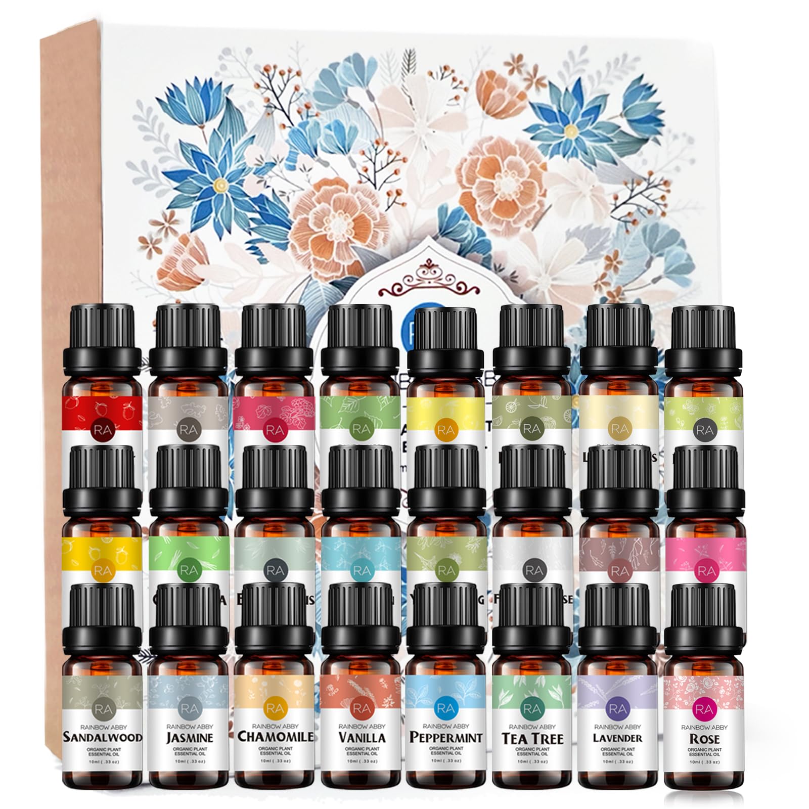 Essential Oils Set - Top 24 for Diffusers, Candle Making Scents, Fragrance, Aromatherapy, Gifts - Lavender, Sandalwood, Orange, Lemon, Rose, Ylang Ylang and More (10mL)Thoughtful Gift Set: Beautifully packaged in an elegant box, making it perfect for special occasions. Ideal for birthdays, holidays, housewarmings, Mother's Day, or any special occasion. Share the gifts of natural aromatherapy with your loved ones who appreciate high-quality essential oils. Fresh Your Home Space: Create the perfect atmosphere in any room with these aromatic oils. Just add a few drops to your diffuser for long-lasting fragrance.Perfect for aroma diffusers, home fragrances and room sprays. Enrich your every day with a fragrant journey. Creative DIY Projects: Perfect for all your creative endeavors! Use these fragrance oils to make your own scented crafts. Compatible with various waxes and bases, these oils are ideal for creating your own unique home fragrances. Let your creativity shine with these versatile oils!. Premium Grade Formulation: All our aromatherapy diffuser oils are made with high-quality natural ingredients, free from harmful chemical fragrances, vegan-friendly, and cruelty-free. Note: Essential oils are for external use only, never use undiluted product directly. Essential Aromatherapy Collection: Discover our premium 24pcs essential oils set, featuring classic aromatherapy favorites - Peppermint, Lavender, Tea Tree, Patchouli, Vanilla, Ginger, Orange, Lemon, Eucalyptus, Sandalwood, Cinnamon, Frankincense, Geranium, Lemon Lemongrass, Chamomile, Jasmine, Rose, Ylang Ylang, Rosemary, Myrrh, Clove, Bergamot, Lemongrass, Grapefruit. Each fragrance oil is carefully selected to create your perfect aromatic experience.