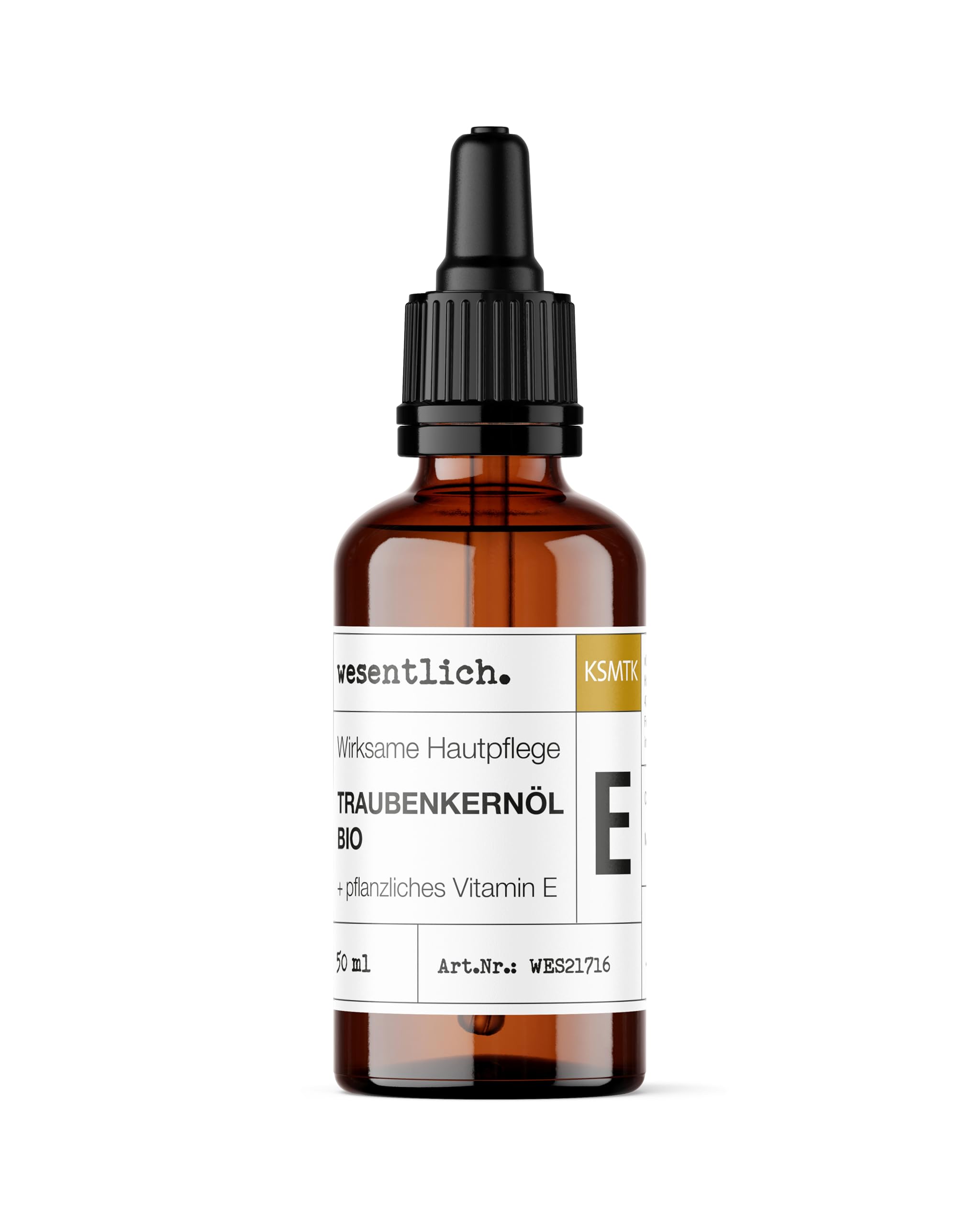 Glass bottle with pipette – durable, hygienic and economical to dose. Hair and massage oil: light, versatile, ideal for massage and cosmetics. Skin and facial care: moisturizing, regenerating, quickly absorbed. Enriched with vitamin E – antioxidants protect and support anti-aging. Organic grape seed oil, cold-pressed, 100 naturally pure, from controlled organic cultivation.wesentlich. Druivenpitolie biologisch met extra vitamine E, natuurzuiver en koudgeperst, cosmetica voor gezicht, huid en anti-aging, glazen fles met pipet, 50 mlGlazen fles met pipet – duurzaam, hygiënisch en zuinig te doseren. Haar- en massageolie: licht, veelzijdig, ideaal voor massage en cosmetica. Huid- en gezichtsverzorging: hydraterend, regenererend, trekt snel in. Verrijkt met vitamine E – antioxidanten beschermen en ondersteunen anti-aging. Biologische druivenpitolie, koudgeperst, 100 natuurzuiver, uit gecontroleerde biologische teelt.