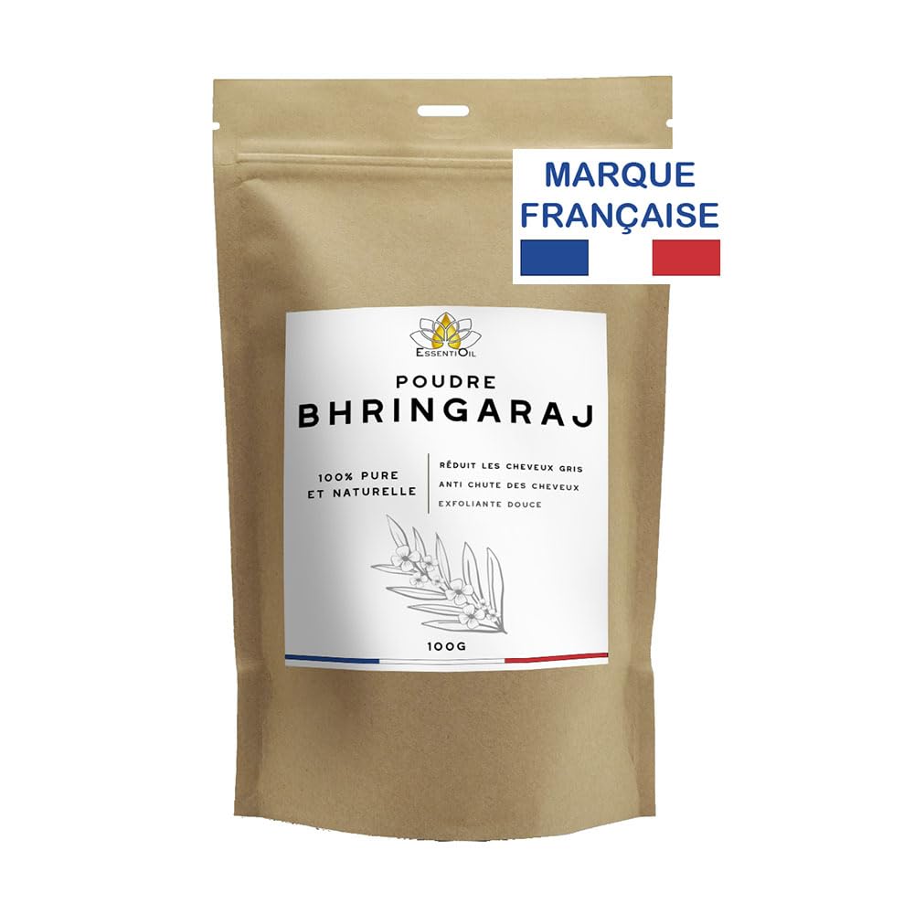 ESSENTIOIL 100 Natural Bhringaraj Powder - Against hair loss, Promotes growth, Soothes the skin - All hair and skin types - 100g - French Brand INSTRUCTIONS FOR USE Mix the Bhringaraj powder with water or natural oil for easy application. DISCLAIMER NOTE: We advise you to always do a test in the crease of the elbow 48 hours before application. In case of contact with eyes or mucous membranes, rinse thoroughly with water. Do not inhale - It is advisable to use a mask and goggles when handling the powder. For herbal medicine uses, seek medical advice. Authorized for Teenagers Adults Not recommended for children and pregnant women. OUR COMMITMENTS: EssentiOil seeks to find you the best products from the best farmers. We are committed to preserving the environment and supporting local communities. French brand. IDEAS FOR USE: Perfect for creating nourishing hair masks or regenerating facial treatments. Mix with water or natural oil for easy application and optimal results. ✓ SKIN BENEFITS: Besides its hair benefits, Bhringaraj is also beneficial for the skin. It is known for its purifying and soothing properties, helping to maintain healthy and radiant skin. ✓ HAIR CARE: Known for its ability to revitalize hair, Bhringaraj powder helps strengthen hair follicles, stimulates hair growth and effectively combats hair loss, providing a fuller and healthier head of hair. PREMIUM QUALITY: Our 100 Natural Bhringaraj Powder is obtained from carefully selected leaves, dried naturally and ground into a fine powder without any additives or fillers, thus preserving its purity and potency. ESSENTIOIL Poudre de Bhringaraj 100 Naturel - Contre la chute de cheveux, Favorise la pousse, Apaise la peau - Tous types de cheveux et de Peaux - 100g - Marque Française MODE D'EMPLOI Mélanger la poudre de Bhringaraj avec de l'eau ou de l'huile naturelle pour une application facile. CLAUSE DE NON-GARANTIE NOTE : Nous vous conseillons de toujours faire un test dans le pli du coude 48h avant application. En cas de contact avec les yeux ou les muqueuses, rincer abondamment à l'eau. Ne pas inhaler – Il est conseillé d'utiliser un masque et des lunettes lors de la manipulation de la poudre. Pour les usages en phytothérapie, demandez conseil à un médecin. Autorisé chez les Ados Adultes Déconseillé chez les enfants et femmes enceintes. NOS ENGAGEMENTS: EssentiOil cherche à vous trouvez les meilleurs produits chez les meilleurs agriculteurs. ous nous engageons à préserver l'environnement et à soutenir les communautés locales. Marque Française. IDÉES D'UTILISATION: Parfait pour créer des masques capillaires nourrissants ou des traitements faciaux régénérants. Mélangez avec de l'eau ou de l'huile naturelle pour une application facile et des résultats optimaux. ✓ BIENFAITS POUR LA PEAU: Outre ses avantages capillaires, le Bhringaraj est également bénéfique pour la peau. Il est connu pour ses propriétés purifiantes et apaisantes, aidant à maintenir une peau saine et radieuse. ✓ SOIN CAPILLAIRE: Reconnue pour sa capacité à revitaliser les cheveux, la poudre de Bhringaraj aide à renforcer les follicules pileux, stimule la croissance des cheveux et combat efficacement la chute des cheveux, offrant une chevelure plus dense et saine. QUALITÉ SUPÉRIEURE: Notre poudre de Bhringaraj 100 Naturelle est obtenue à partir de feuilles soigneusement sélectionnées, séchées naturellement et moulues en une fine poudre sans additifs ni agents de remplissage, préservant ainsi sa pureté et son efficacité.