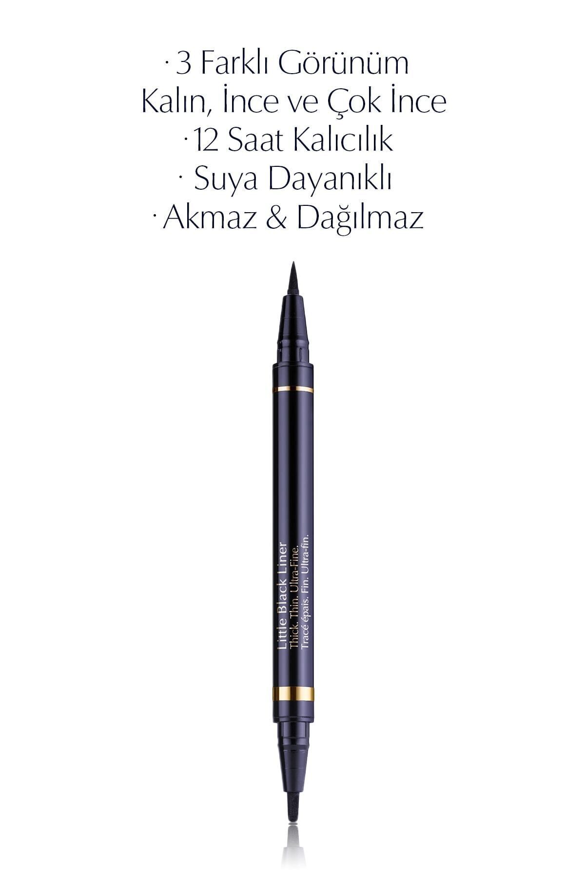 Iki uçlu Little Black Liner 3 farkli görünüme kavusmaniza yardimci olur. –kalin, ince ve çok ince. Yeni likit eyeliner'in kullanimi ilk defa deneyenler için bile çok kolaydir. Gözlerin üzerine bosluk birakmadan kolayca sürülebilir. Ipeksi dokuya sahiptir. Siyah renkli ve suya dayanikli formülü ürünün gün boyu akmasini engeller. 12 saat boyunca dagilmadan kalicilik etkisine sahiptir.