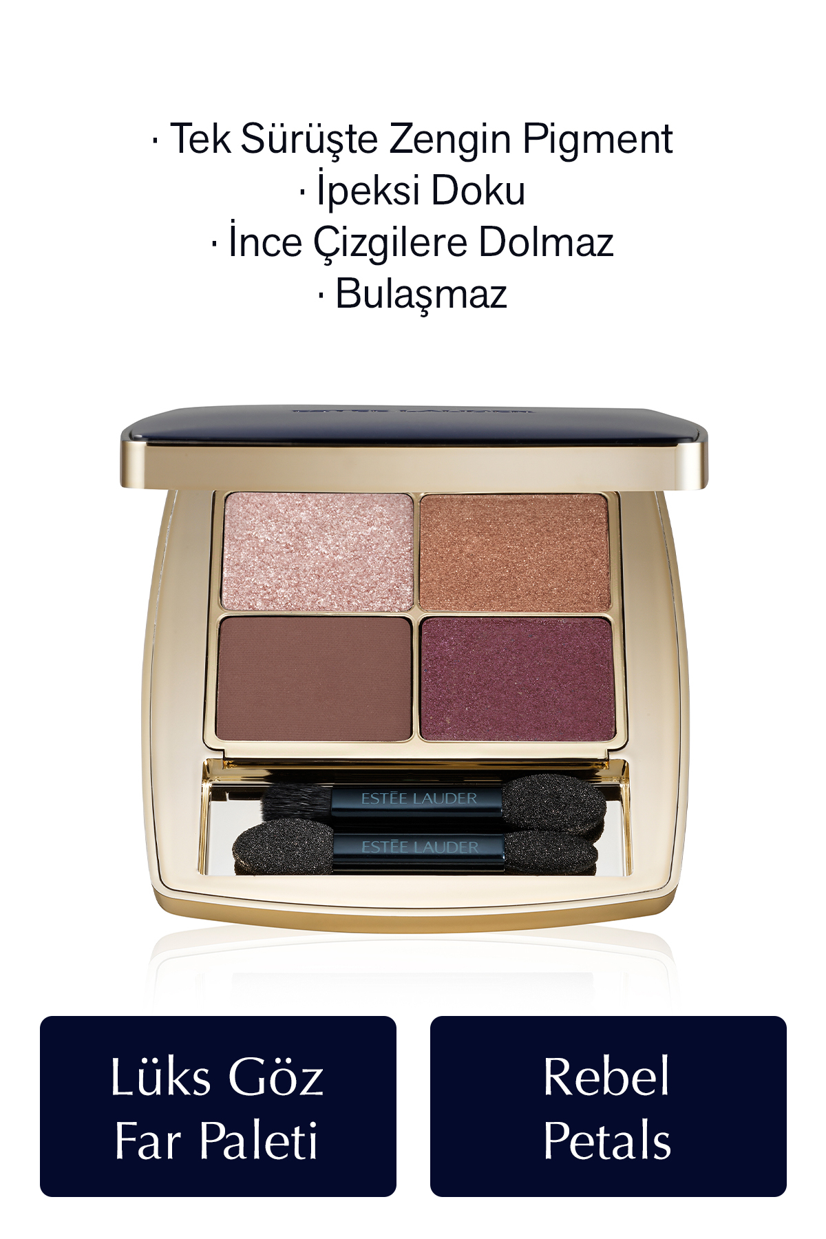 Canli tonlariyla ve pigmentli bitisi ile gözlerinizdeki ifadeyi ortaya çikarir. Pigment açisindan zengin ve ipeksi dokusuyla göz kapaginizda yumusakça kayar ve zahmetsizce dagilir. Nötr tonlarin, beklenmedik vurgularla her palette isiltili, saten ve mat tonlarinin birbirleriyle uyum içerisinde olusu. Uygulanan gölgelendirmeler ile gündüz için yumusak tonlardan, gece için daha vurgulayici bir görünüme makyajinizi çikarmadan geçebilirsiniz.Yeniden doldurulabilir paletler, elinizde sik ve sehvetli hissettirir. Isiltili kivrimlarindan olaganüstü kalitesine kadar, bu modern cazibe, kalici lüks bir görünüme dönüsür.Çift uçlu aplikatörü ile birlikte gelir. Gözlerinizdeki her duyguyu ortaya çikarin. Zengin bir bakir, pigmentli bir altin, isiltili bir rose-gold ve koyu çikolata kahverengisi ile sicak bir palet. BITIS:Her palet, trend ekibimiz tarafindan seçilen Isiltili, Saten ve Mat yüzeylerde bir veya iki gölge içerir. FORM: Pudra göz fari. Doldurulabilir kompakt ayna, 2 aplikatör içerir. FORMÜL ÖZELLIKLERI:• Göz doktoru tarafindan test edilmistir