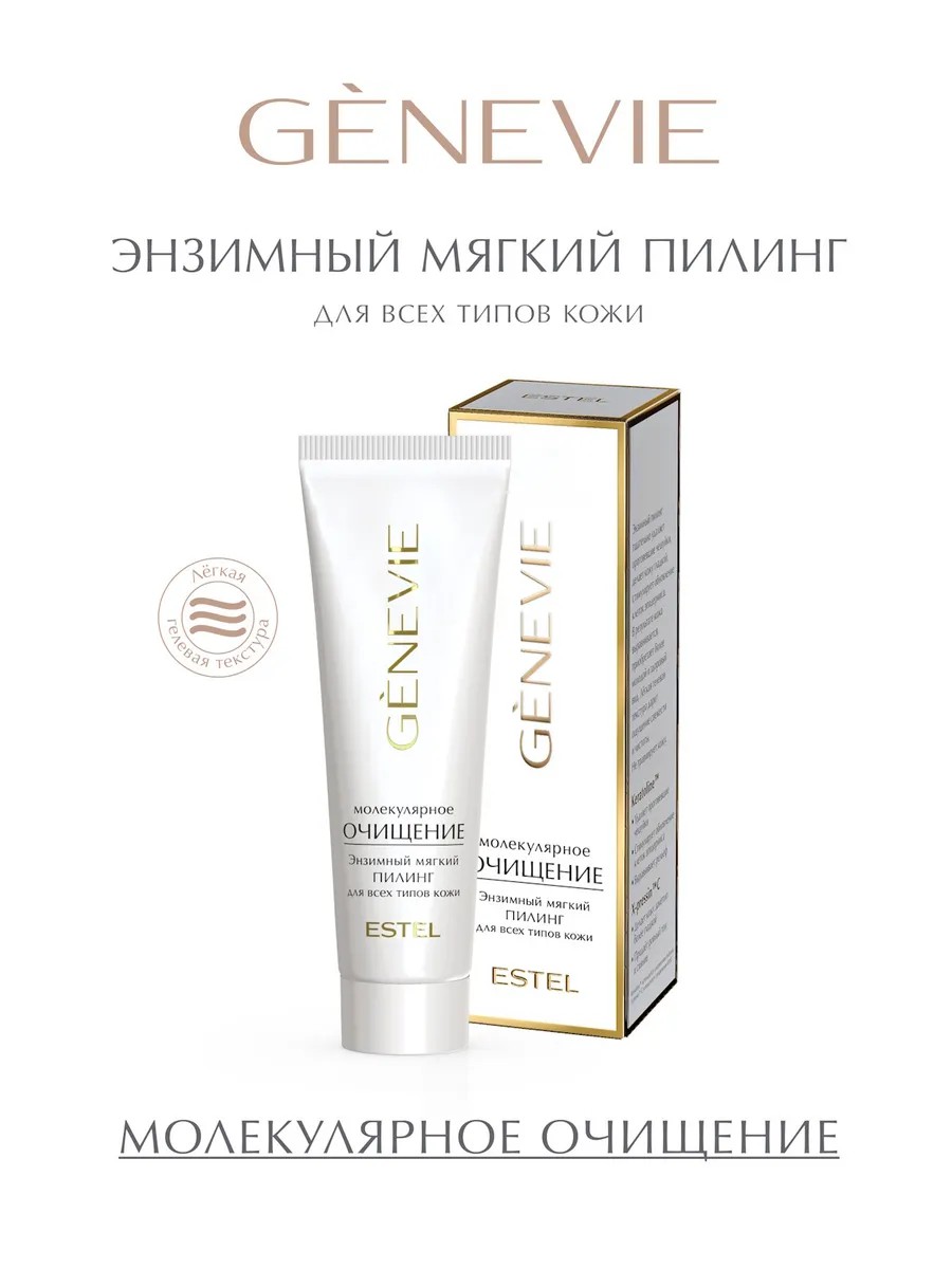 Энзимный пилинг для лица GENEVIE ESTEL Молекулярное очищение подходит для всех типов кожи, включая чувствительную. Его мягкая формула эффективно удаляет ороговевшие клетки, улучшает текстуру и возвращает лицу свежесть без раздражения и повреждений. Ферменты папаина и Bacillus Ferment деликатно растворяют омертвевшие клетки, способствуя естественному обновлению кожи. Благодаря этому улучшается цвет лица, уменьшается тусклость, кожа становится более гладкой и сияющей. Комплекс Keratoline ускоряет процессы регенерации, выравнивает рельеф и помогает поддерживать здоровый внешний вид. X-Pressin придаёт коже ровный тон, устраняет следы усталости и возвращает естественное сияние. Увлажняющие компоненты защищают от сухости, дарят ощущение комфорта и мягкости. Лёгкая гелевая текстура легко распределяется, дарит ощущение чистоты и свежести, подходит для регулярного применения. Сраб решает такие проблемы, как неровность поверхности, тусклый цвет лица, избыточное скопление ороговевших клеток. Подходит как для молодой кожи с первыми признаками обезвоженности, так и для возрастной, требующей обновления и тонуса. Очищающие средство позволяет уменьшить выраженность мелких морщин, улучшить впитываемость уходовой косметики и повысить эффективность последующих этапов ухода. В результате кожа становится заметно более ровной, гладкой, сияющей и ухоженной, приобретает здоровый и молодой вид.