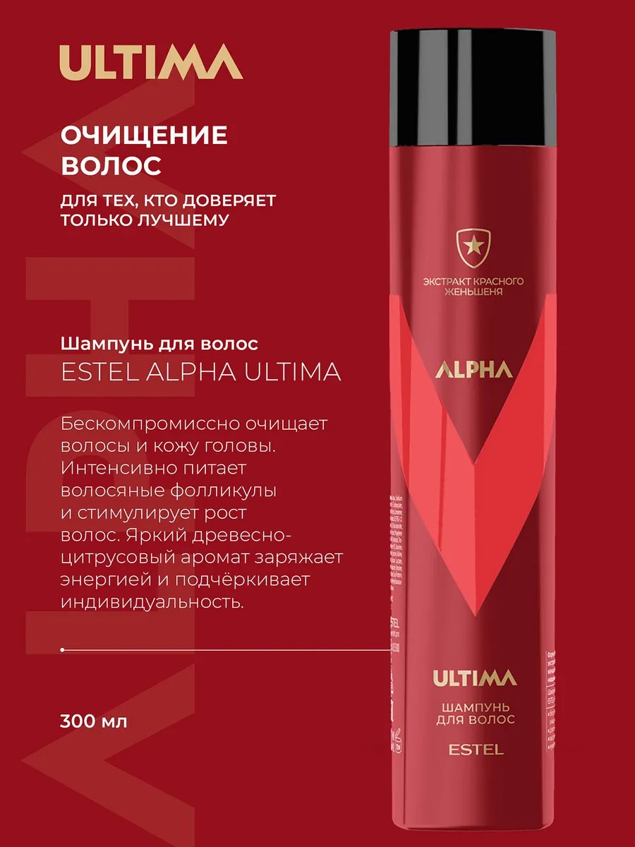 ESTEL ALPHA ULTIMA professional men's anti-hair loss shampoo is designed for comprehensive care of hair prone to hair loss and slow growth. Suitable for all hair types, it is especially recommended for men with weakened roots. The formula with red ginseng extract awakens follicle strength, energizes the scalp, stimulates growth, and improves nutrition along the entire length.