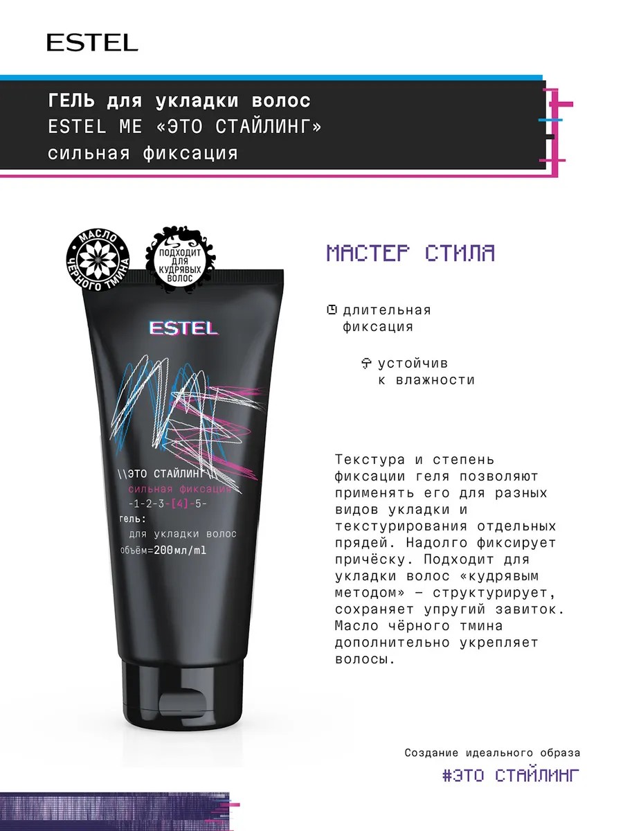 Профессиональный текстурирующий гель сильной фиксации ESTEL универсальный стайлинг для создания любых форм причесок, для тех, кто хочет подчеркнуть кудрявые, вьющиеся локоны или создать текстурные пряди на короткие и длинные волосы без утяжеления. Подходит как для мужской, так и для женской укладки непослушных, склонных к пушистости волос, которым требуется эластичная фиксация и ухоженный вид. Сохраняет идеальную прическу в течение всего дня. Фиксатор возможно использовать для укладки бровей, бороды и усов. Средство равномерно распределяется и усиливает блеск. Формула с пантенолом придаёт волосам ухоженный вид, увлажняет, улучшает эластичность и делает их более устойчивыми к внешним воздействиям. Натуральное масло чёрного тмина укрепляет корни, придаёт блеск, помогает бороться с ломкостью и делает волосы визуально более густыми.