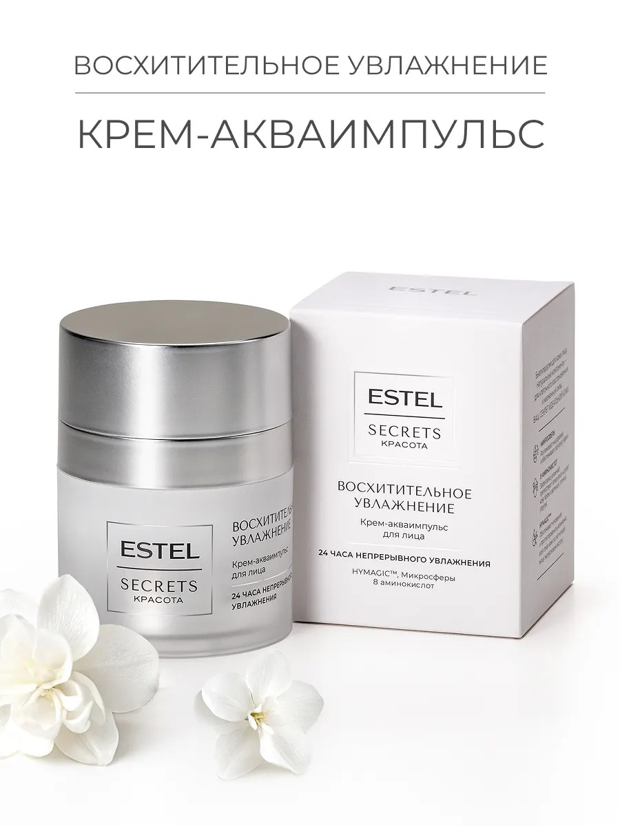 Крем-акваимпульс SECRETS КРАСОТА ESTEL Восхитительное увлажнение создан для интенсивного ухода за кожей лица, нуждающейся в глубоком увлажнении. Уникальная формула сочетает 4 вида гиалуроновой кислоты, которые проникают в разные слои кожи, наполняют клетки влагой и восстанавливают гидробаланс. Комплекс из 8 аминокислот укрепляет защитный барьер, препятствует потере влаги и поддерживает упругость. Экстракт алоэ насыщает кожу витаминами и придаёт ощущение свежести. Витамин Е действует как мощный антиоксидант, замедляя процессы старения и защищая от воздействия окружающей среды. Матирующие микросферы разглаживают поверхность кожи и создают эффект «софт-фокус», выравнивая тон и делая лицо гладким. Увлажняющий крем подходит для всех типов кожи, включая сухую, чувствительную и склонную к обезвоживанию. Он мгновенно устраняет чувство стянутости, возвращает комфорт, улучшает эластичность и повышает тонус. После использования кожа становится бархатистой, свежей и сияющей.