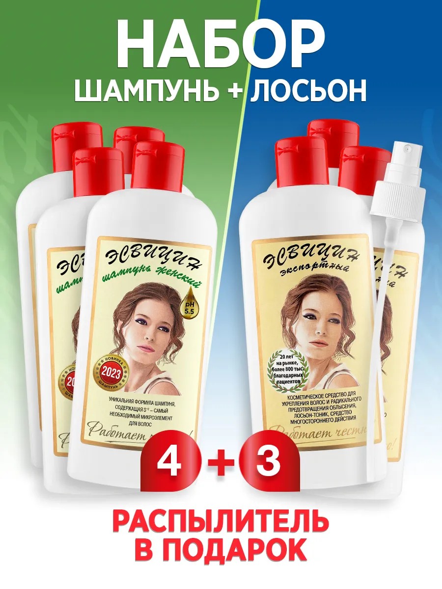 Комплексный набор для роста волос от выпадения, включающий бессульфатный пептидный шампунь Эсвицин для женщин и мужчин (4 флакона) и легендарный лосьон-тоник Эсвицин (3 флакона).