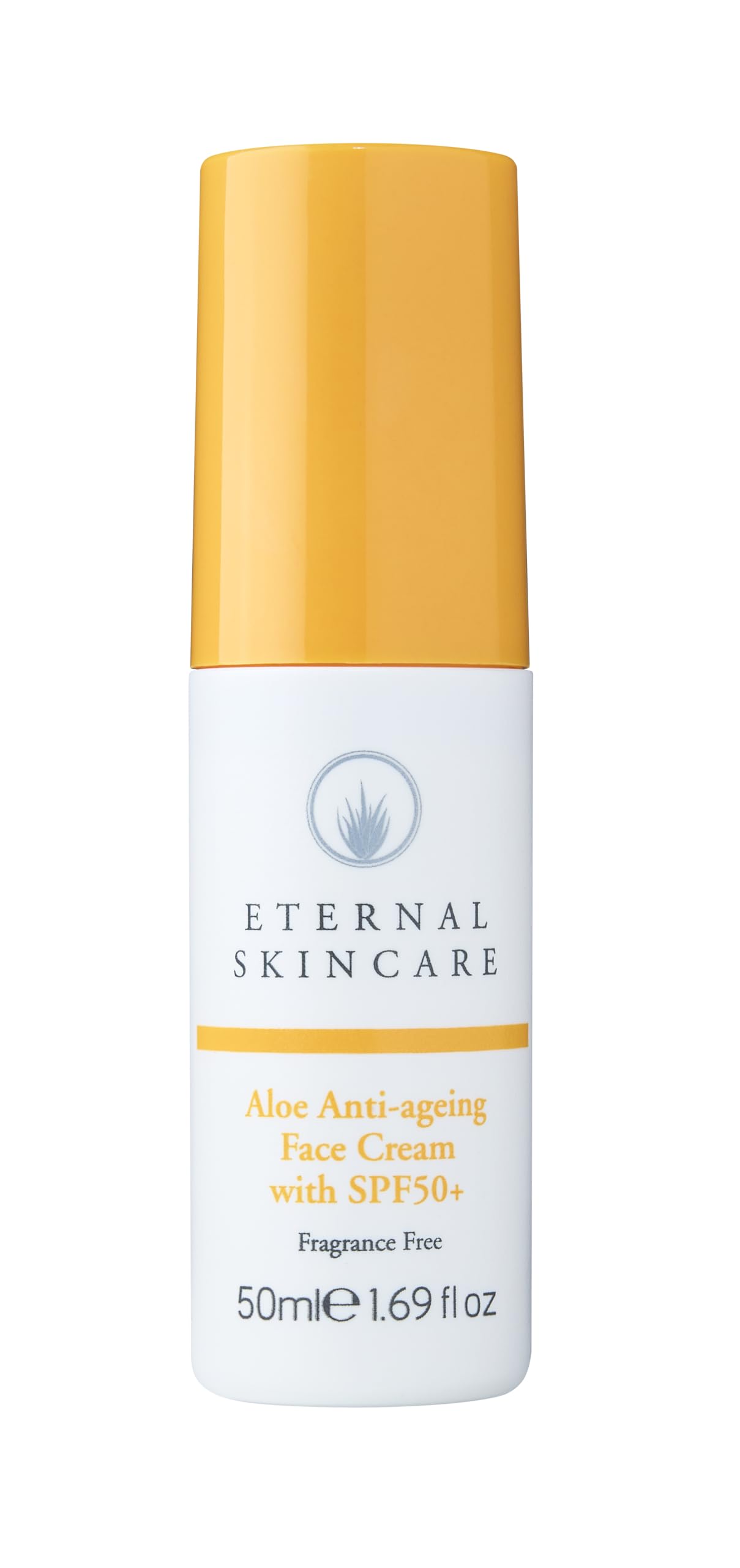Protect and enhance your skin with the Anti-Aging Aloe Face Cream SPF 50 . Your daily essential for hydrated, comfortable, and beautifully protected skin. Its ultra-light, fragrance-free formula offers high UVA and UVB protection while leaving an almost imperceptible feel on the skin. Designed to absorb quickly without leaving a greasy residue, it applies easily under makeup for a smooth, long-lasting finish. Enriched with soothing organic aloe vera, it helps calm sensitive skin and maintain hydration throughout the day. Dermatologically tested and non-irritating, it is suitable for all skin types, including sensitive and delicate skin. Thanks to its blue light defense technology, this versatile moisturizer also helps protect skin from the aging effects of daily screen exposure. Enjoy fresh, protected skin every day, ready to take on the day. SAFETY WARNING Avoid contact with eyes. In case of contact with eyes, rinse immediately and thoroughly with water. Avoid contact with fabrics.Daily Blue Light Defense – Helps protect skin from the effects of daily screen exposure for healthy-looking, radiant skin. Dermatologically tested for sensitive skin – Gentle, fragrance-free formula designed to minimize the risk of irritation and suitable for sensitive and delicate skin. Moisturizing and soothing care – Enriched with organic aloe vera to soothe, hydrate, and support the skin's natural barrier throughout the day. Ultra-light texture, ideal under makeup – Silky, non-greasy texture that absorbs quickly and applies perfectly under makeup for a smooth, even finish. Broad-spectrum SPF 50 protection – High protection against UVA and UVB rays to help prevent premature aging and the effects of the sun.Eternal Skincare – Crème Visage Anti-Âge à l'Aloe SPF 50 (50ml) - Hydratation Quotidienne, Protection UVA UVB, Défense contre la Lumière Bleue, Aloe Vera Apaisant, Sans Parfum, Pour Peaux SensiblesDESCRIPTION DU PRODUIT DESCRIPTION DU PRODUIT Protégez et sublimez votre peau avec la Crème Visage Anti-Âge à l'Aloe SPF 50 . Votre essentiel quotidien pour une peau hydratée, confortable et magnifiquement protégée. Sa formule ultra légère et sans parfum offre une protection élevée contre les UVA et UVB tout en laissant une sensation presque imperceptible sur la peau. Conçue pour pénétrer rapidement sans effet gras, elle s'applique facilement sous le maquillage pour un fini lisse et durable. Enrichie en aloe vera biologique apaisant, elle contribue à calmer les peaux sensibles et à maintenir l'hydratation tout au long de la journée. Dermatologiquement testée et non irritante, elle convient à tous les types de peau, y compris les peaux sensibles et délicates. Grâce à sa technologie de défense contre la lumière bleue, ce soin hydratant polyvalent aide également à protéger la peau des effets du vieillissement liés à l'exposition quotidienne aux écrans. Profitez chaque jour d'une peau fraîche, protégée et prête à affronter la journée. AVERTISSEMENT DE SÉCURITÉ Éviter tout contact avec les yeux. En cas de contact avec les yeux, rincer immédiatement et abondamment à l'eau. Éviter tout contact avec les tissus.Défense Quotidienne contre la Lumière Bleue – Aide à protéger la peau des effets de l'exposition quotidienne aux écrans pour une peau d'apparence saine et éclatante. Testée Dermatologiquement pour Peaux Sensibles – Formule douce, sans parfum, conçue pour minimiser les risques d'irritation et convenir aux peaux sensibles et délicates. Soin Hydratant et Apaisant – Enrichie en aloe vera biologique pour apaiser, hydrater et soutenir la barrière cutanée naturelle tout au long de la journée. Texture Ultra Légère, Idéale Sous le Maquillage – Texture soyeuse, non grasse, qui pénètre rapidement et s'applique parfaitement sous le maquillage pour un fini lisse et uniforme. Protection SPF 50 à Large Spectre – Protection élevée contre les rayons UVA et UVB pour aider à prévenir le vieillissement prématuré et les effets du soleil.